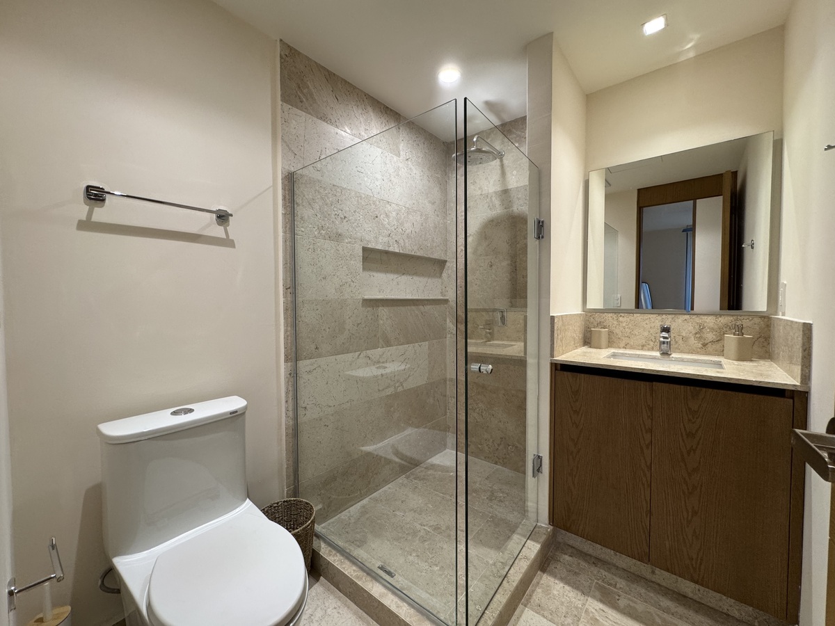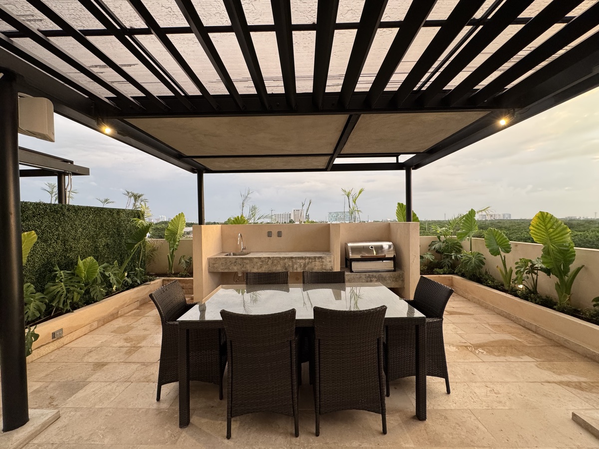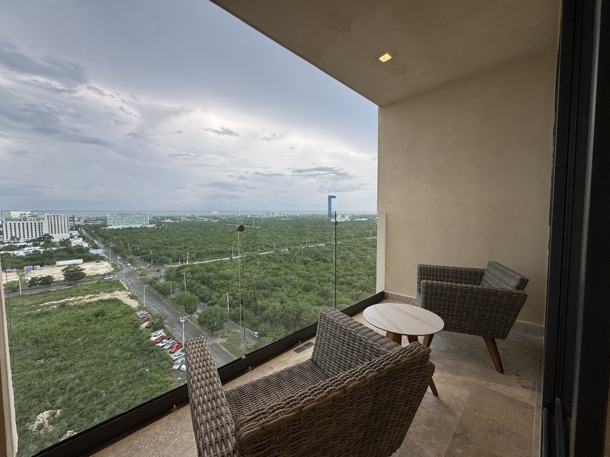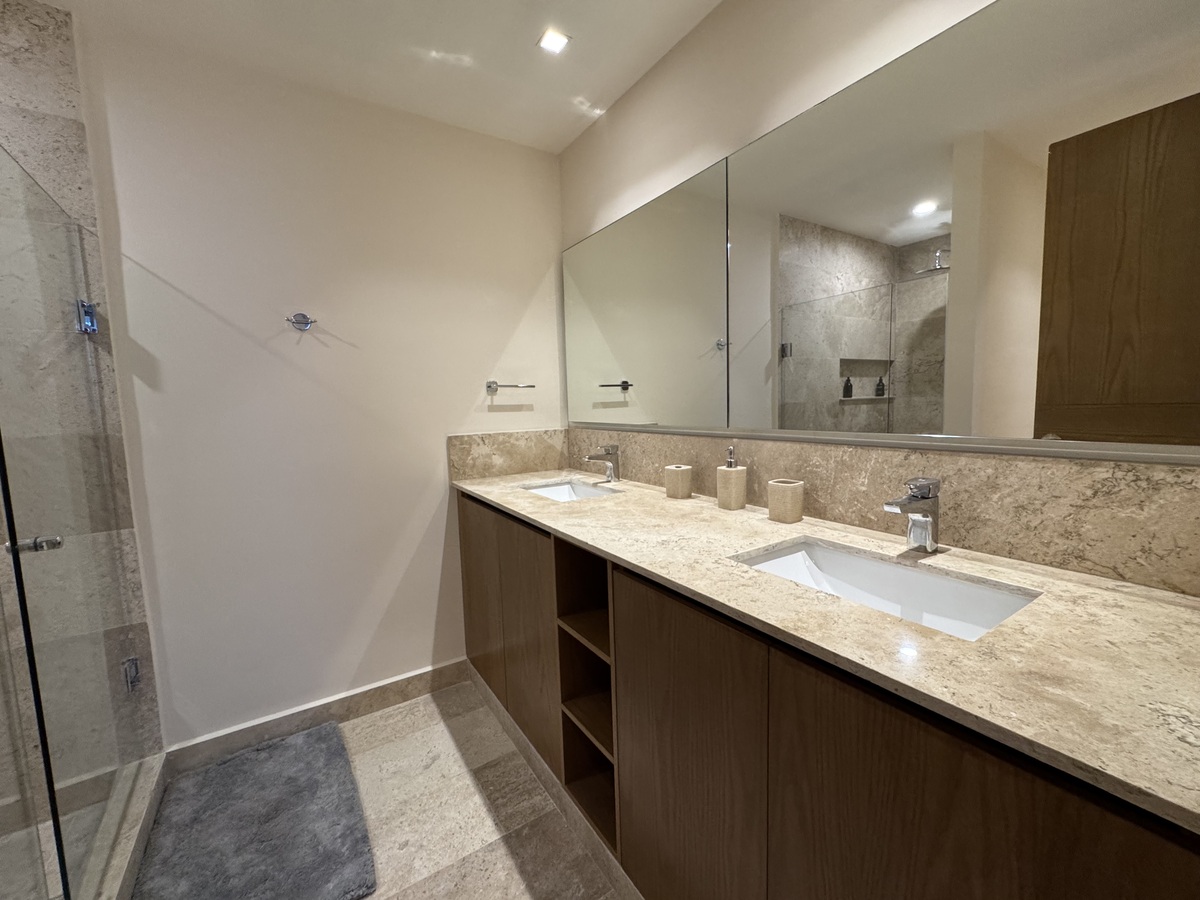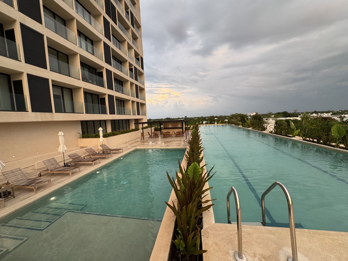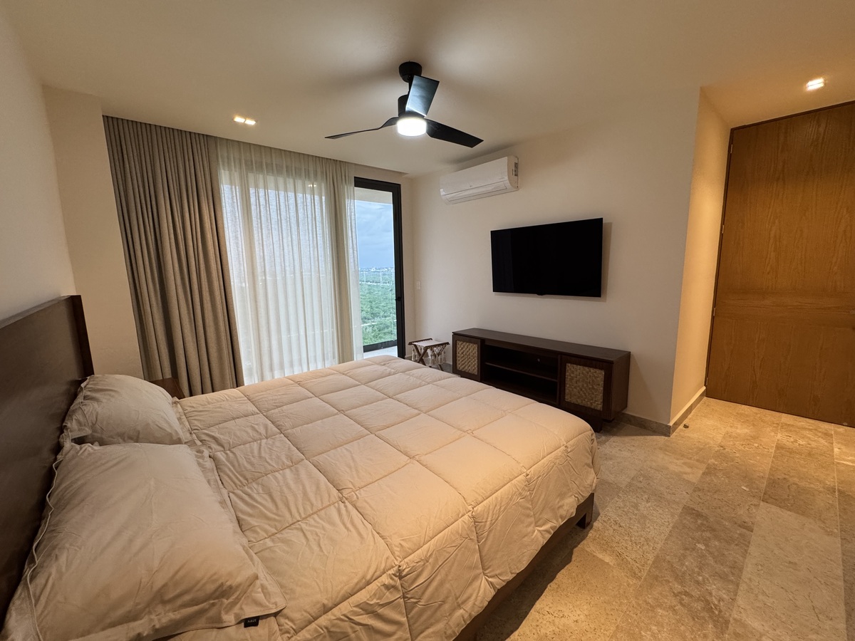 Totalmente amueblado y equipado a estrenar, con mobiliario y electrodomésticos nuevos, amplios espacios, acabados de primera y un balcón panorámico que conecta ambas recámaras.