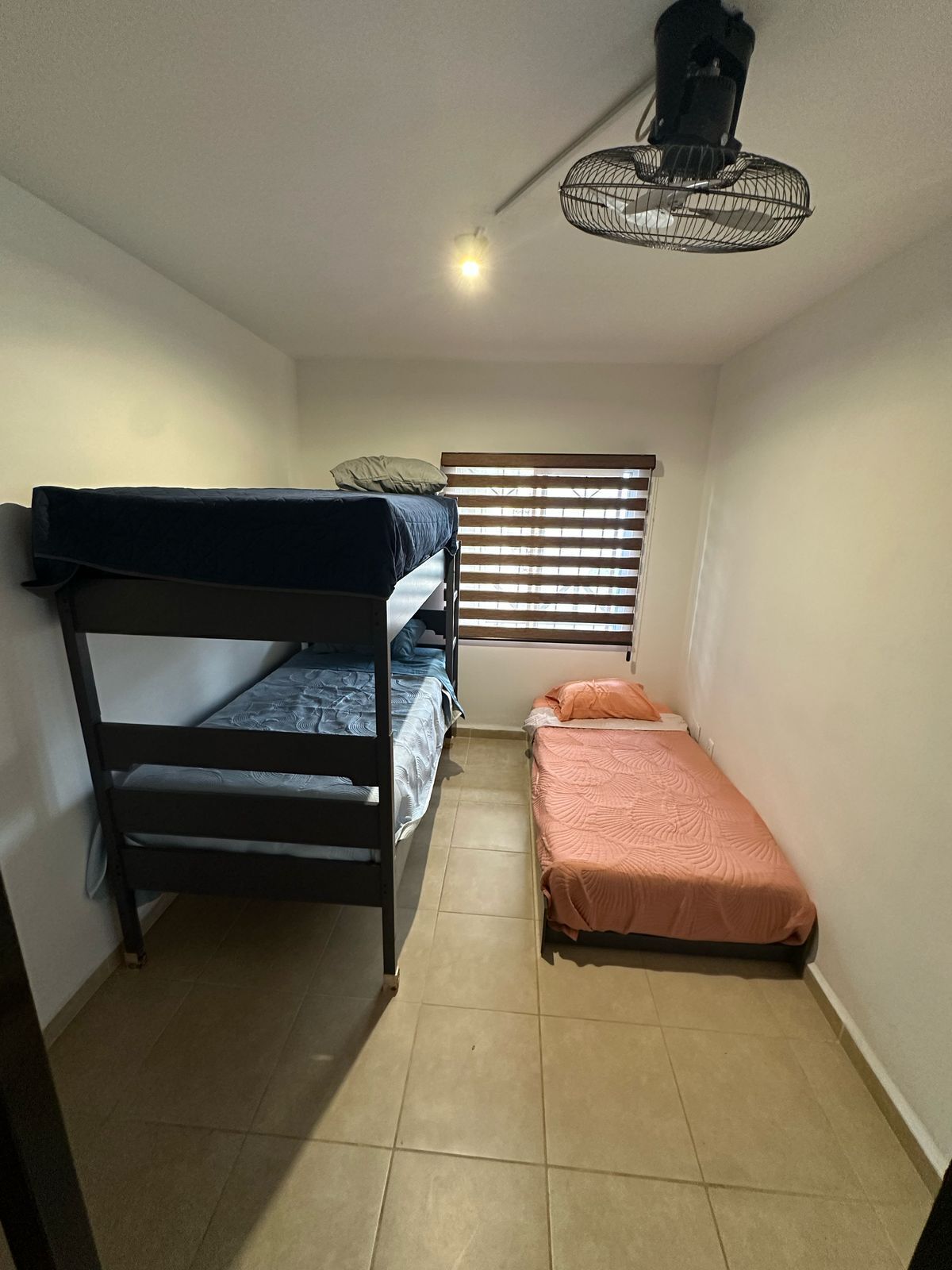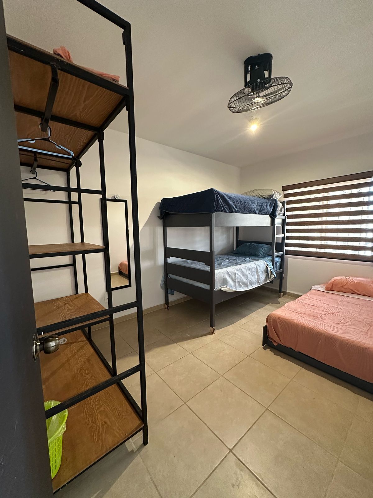 -Distribución de muebles: litera de tres niveles, una cama king size y un sofá cama.