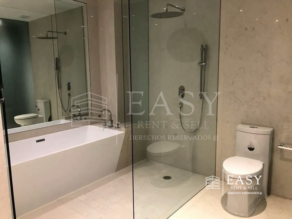 Cuenta con 2 recámaras, la principal tiene baño completo con tina, vestidor y balcón; la segunda recamara baño completo y closet; un baño de visitas completo, sala comedor, cocina integral equipada, cuarto de lavado, bodega, mantenimiento incluido. Gimnasio común, área de chóferes, site completo, vigilancia y elevador de autos.