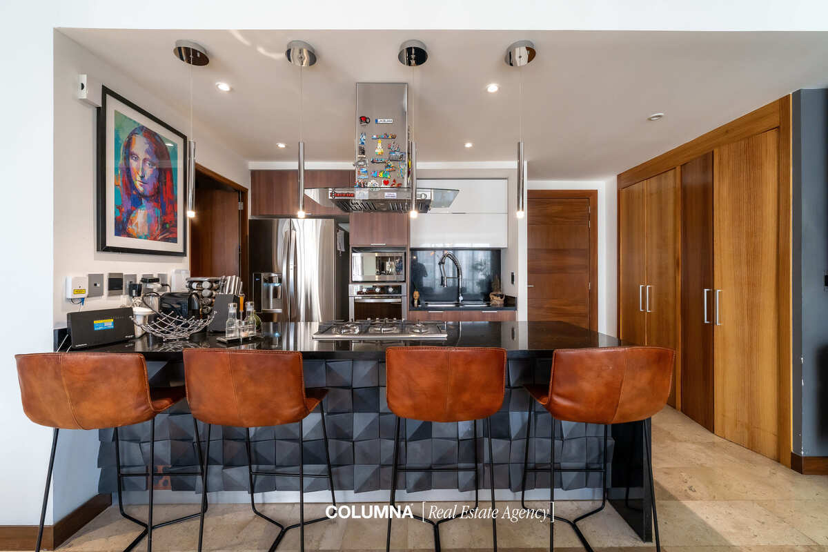 The social area is another strong point of the apartment. With a modern and open design, the space is perfect for enjoying a gathering with friends or relaxing after a long day. The kitchen is spacious and has everything you need to cook comfortably: a breakfast bar, refrigerator, electric oven, and a washer-dryer that provide all the practicality you seek in a home.