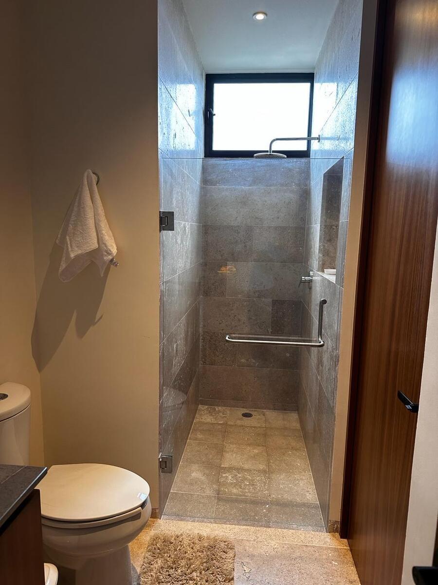 Shower enclosure in the bathroom made of fixed tempered glass.