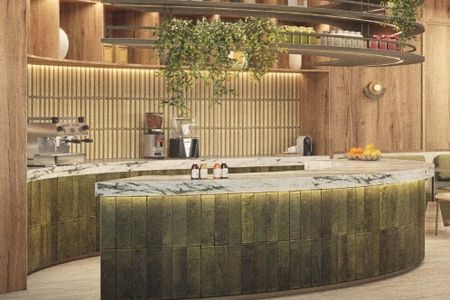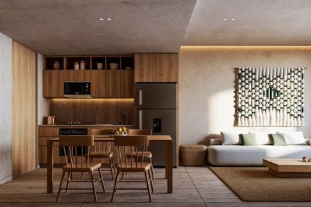Barra desayunadora, estufa eléctrica, microondas y refrigerador