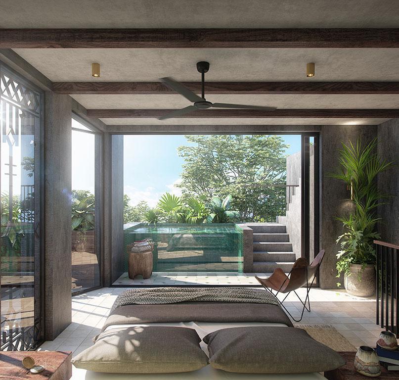 Its design uses local stone, blackish polished concrete and shades of Jade green that blend in with its jungle environment.