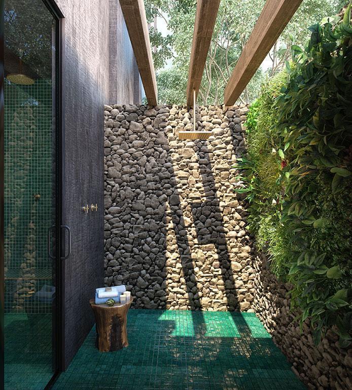 Su diseno utiliza piedra de la zona, concreto pulido negruzco y tonos de verde Jade que se mimetizan con su entorno selvatico.