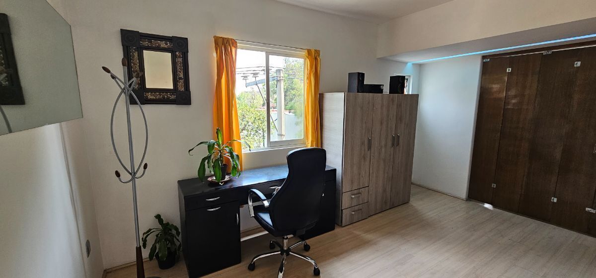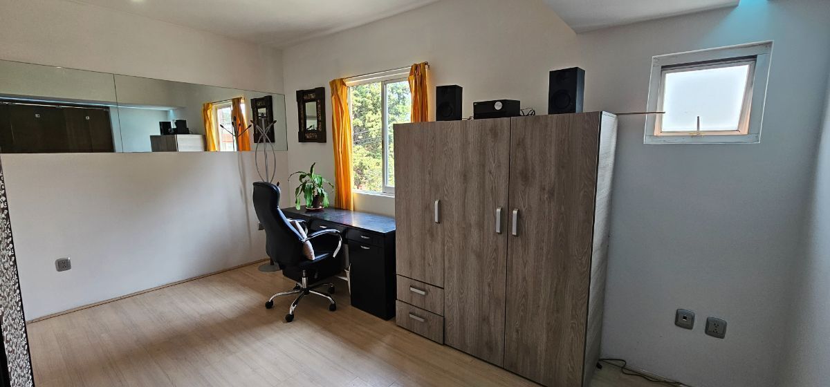 2 recámaras la principal con closet y cama matrimonial y tocador, la recámara secundaria está adaptada como estudio