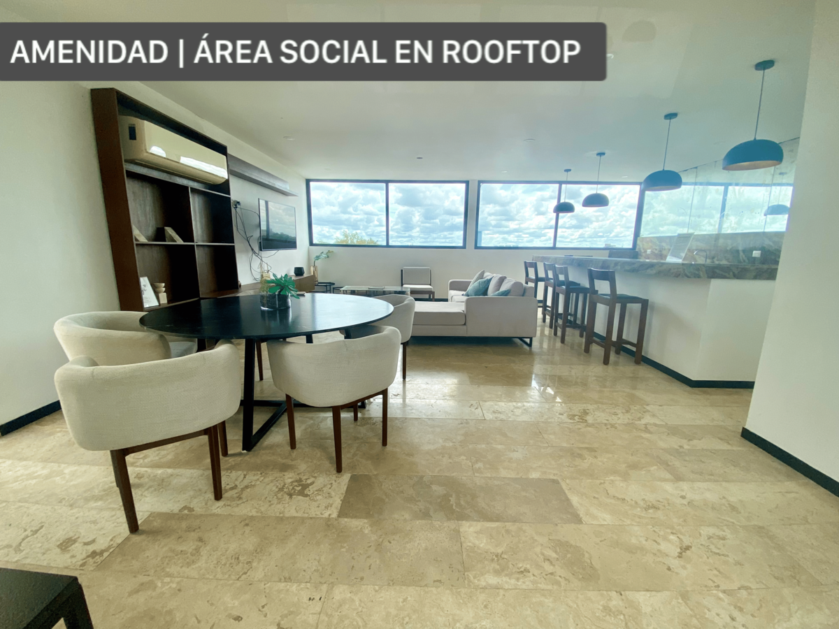 Roof top en 4 nivel con: área climatizada, sala de estar, cuenta con barra de bar y comedor, ideal como área social.
