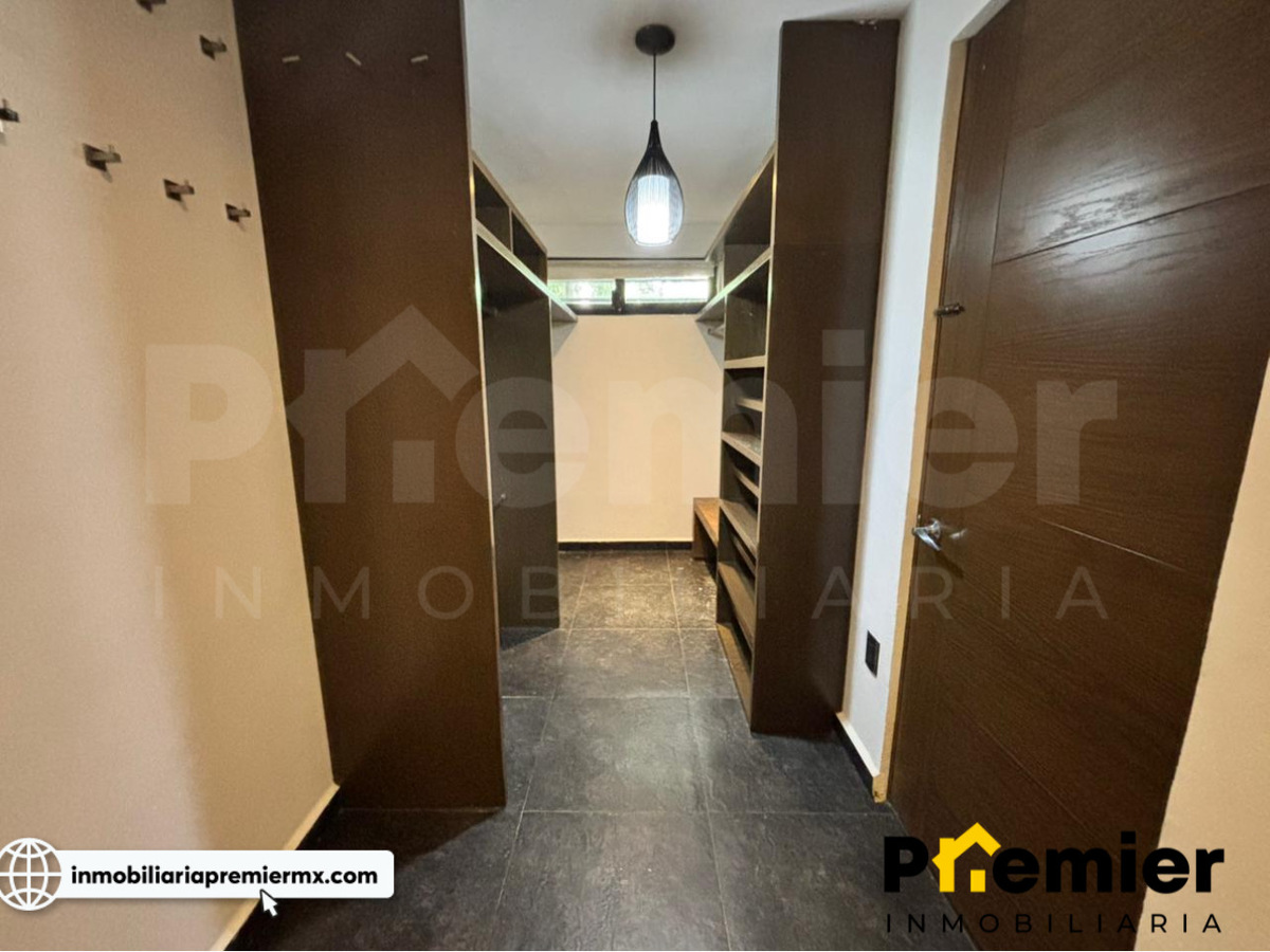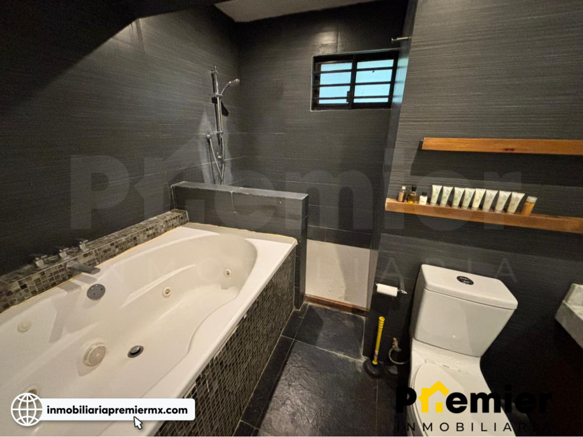 Habitación principal con cama king size, clóset, baño propio con tina y regadera, y acceso compartido al walk-in closet.