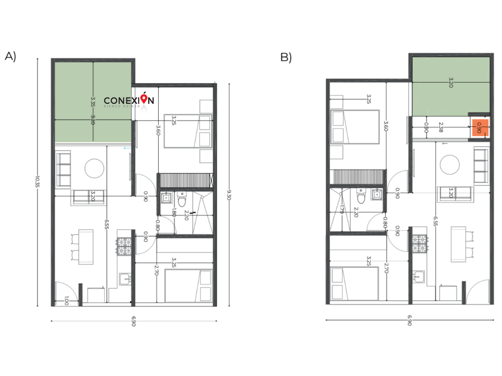 Departamento de 67.21m2 total y 55.96m2 habitables.