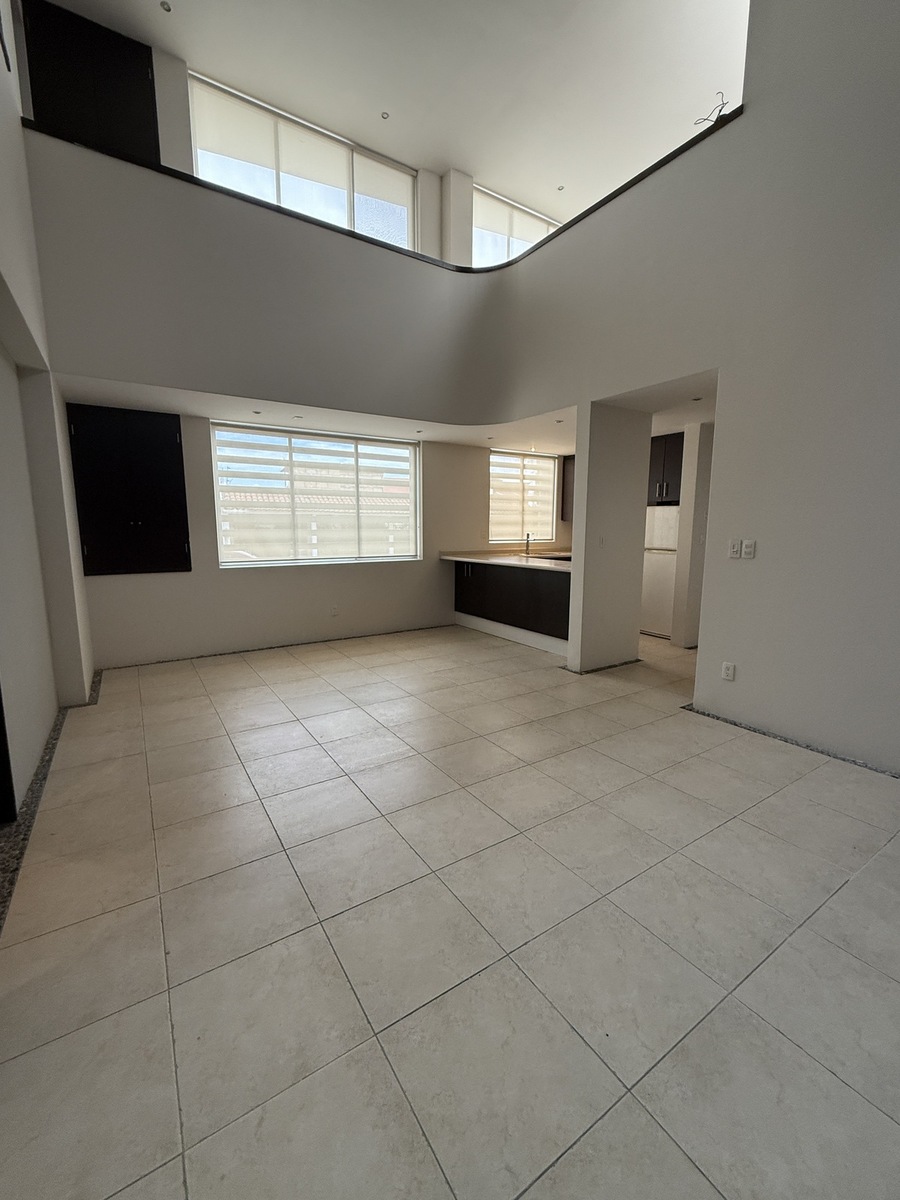 Primer nivel estacionamiento para 2 autos, estancia con cocina abierta, una pequeña covacha para guardar, medio baño de visitas. Segundo nivel con una sala de tv y Recámara con baño y vestidor.