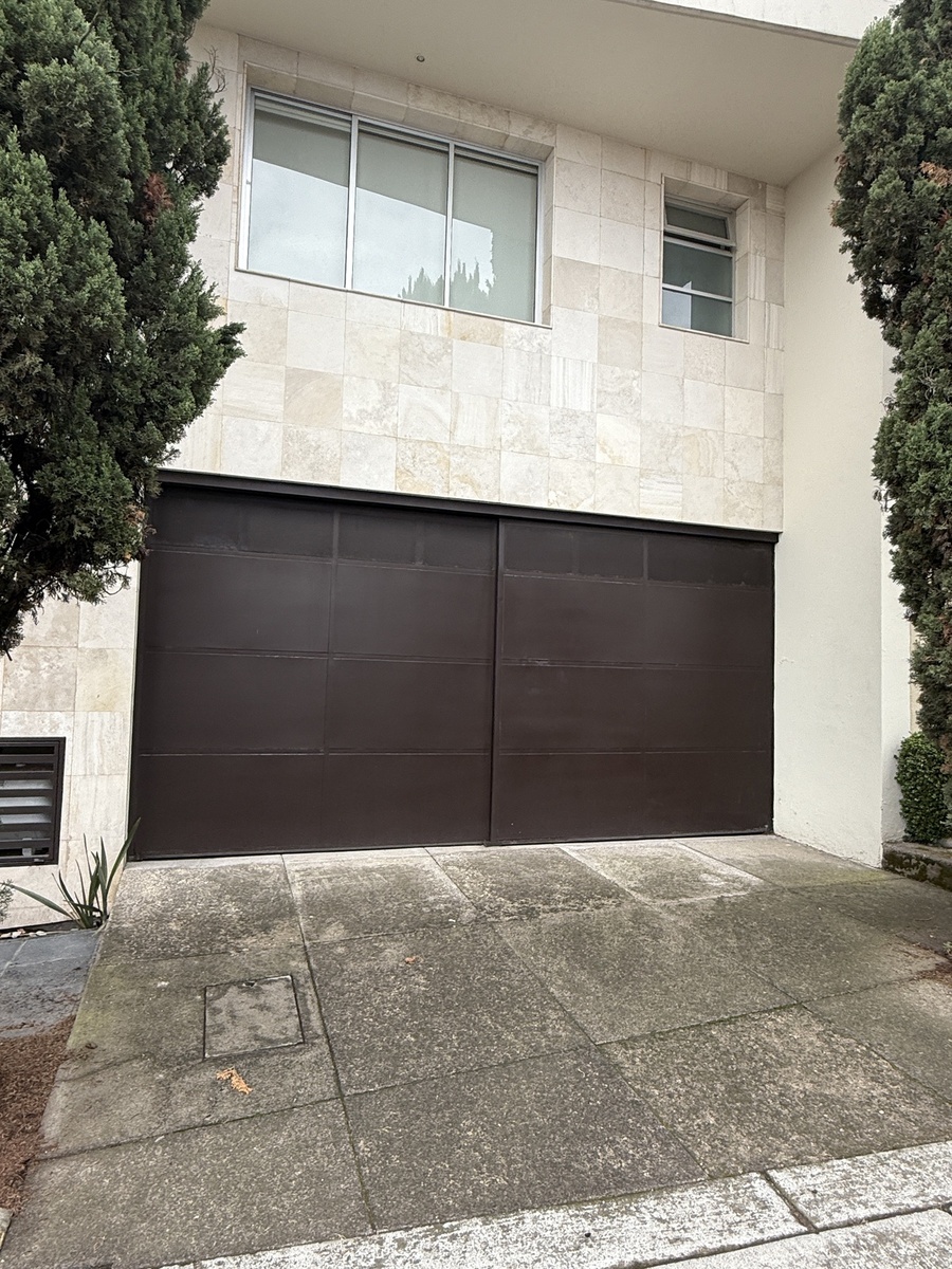First level has parking for 2 cars, living room with open kitchen, a small storage room, and a half bathroom for guests. Second level with a TV room and bedroom with bathroom and dressing room.