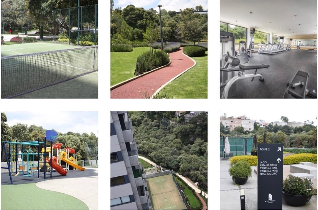 El Residencial tiene amenidades como alberca, jardines, salon de usos múltiples, roofgarden con asador, pista de jogging, canchas de tenis y paddel, ludoteca, cafetería y áreas de juego.