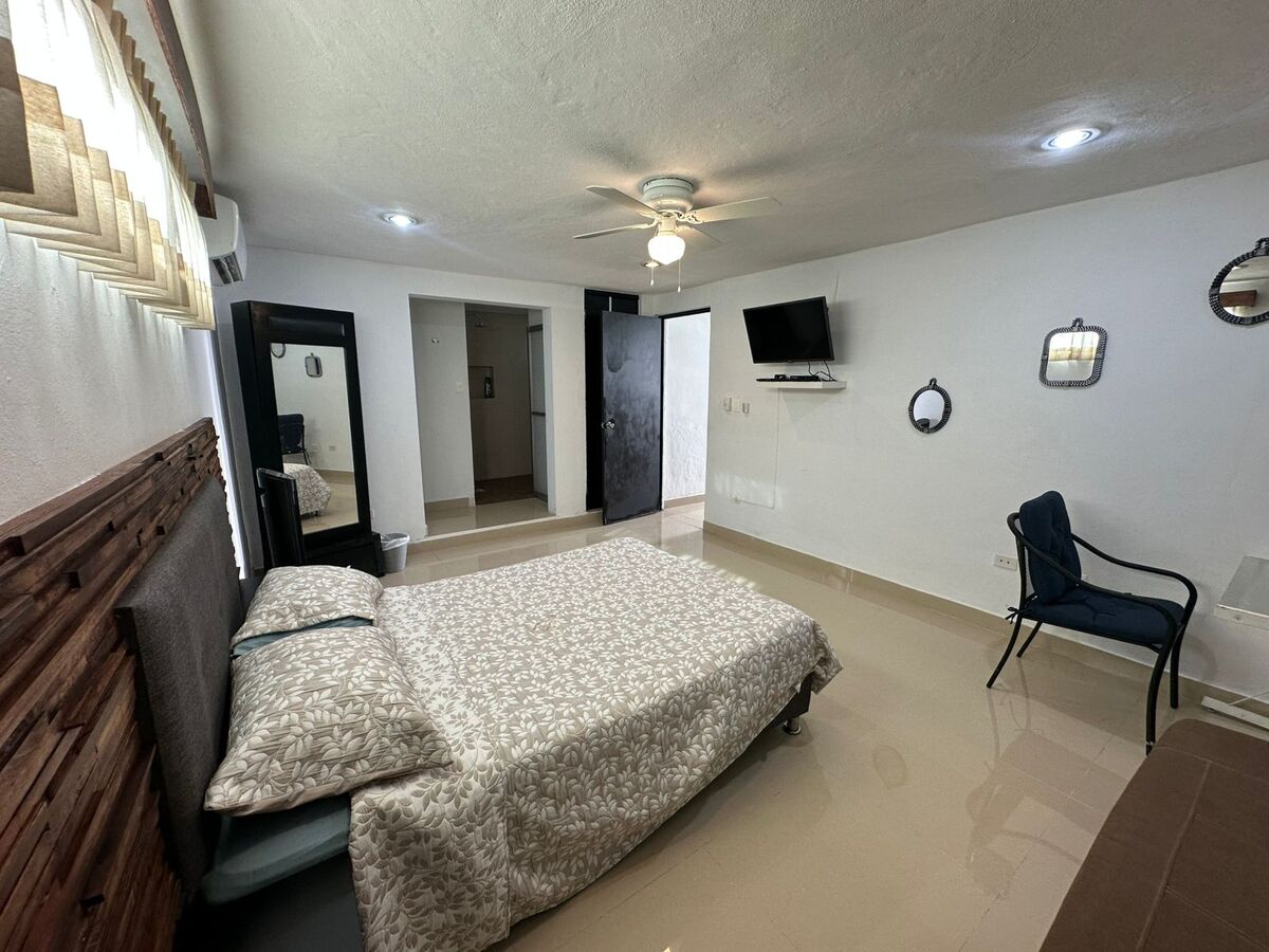 Recámara con cama, sofá cama, escritorio, TV, clóset y baño completo.