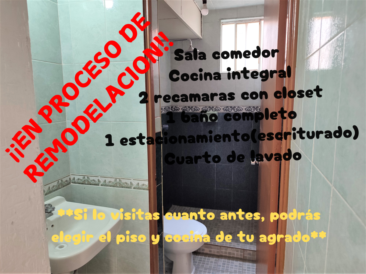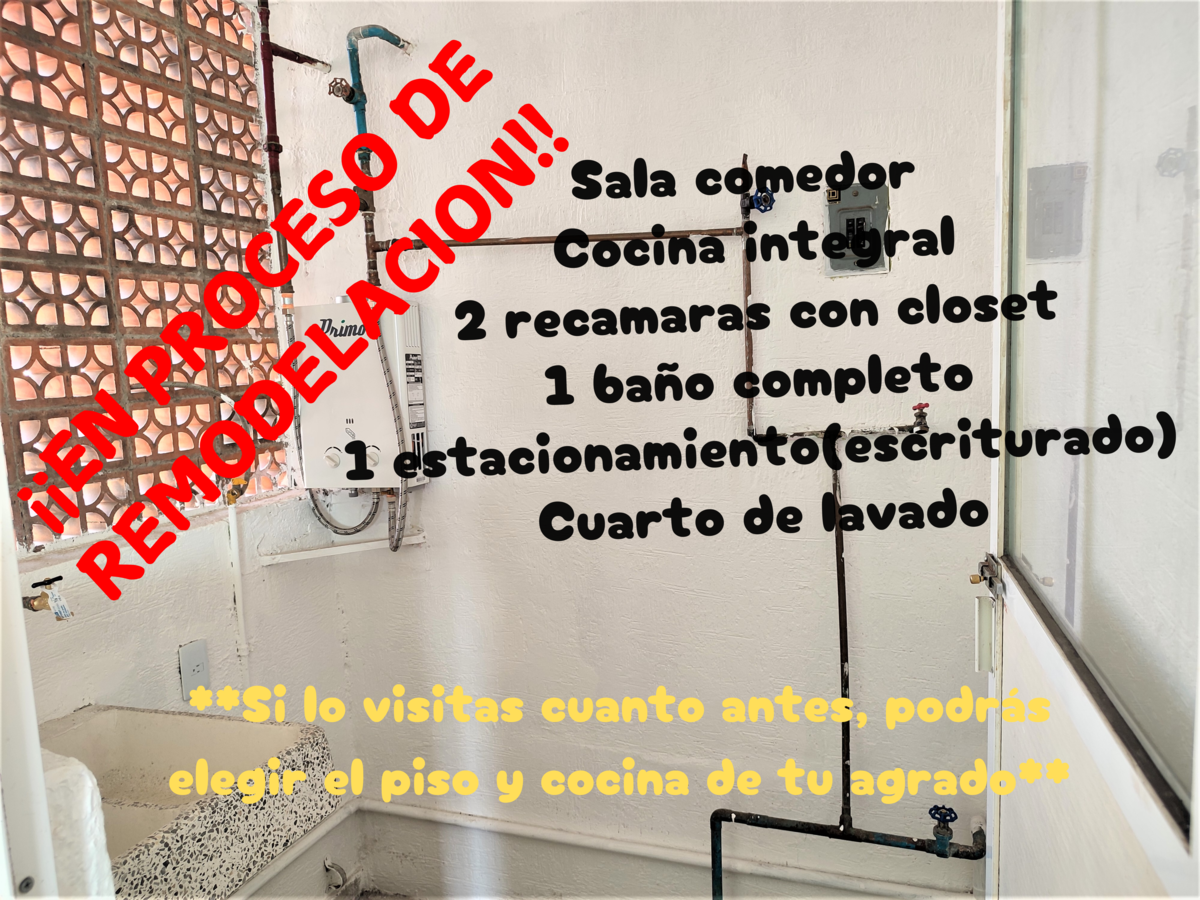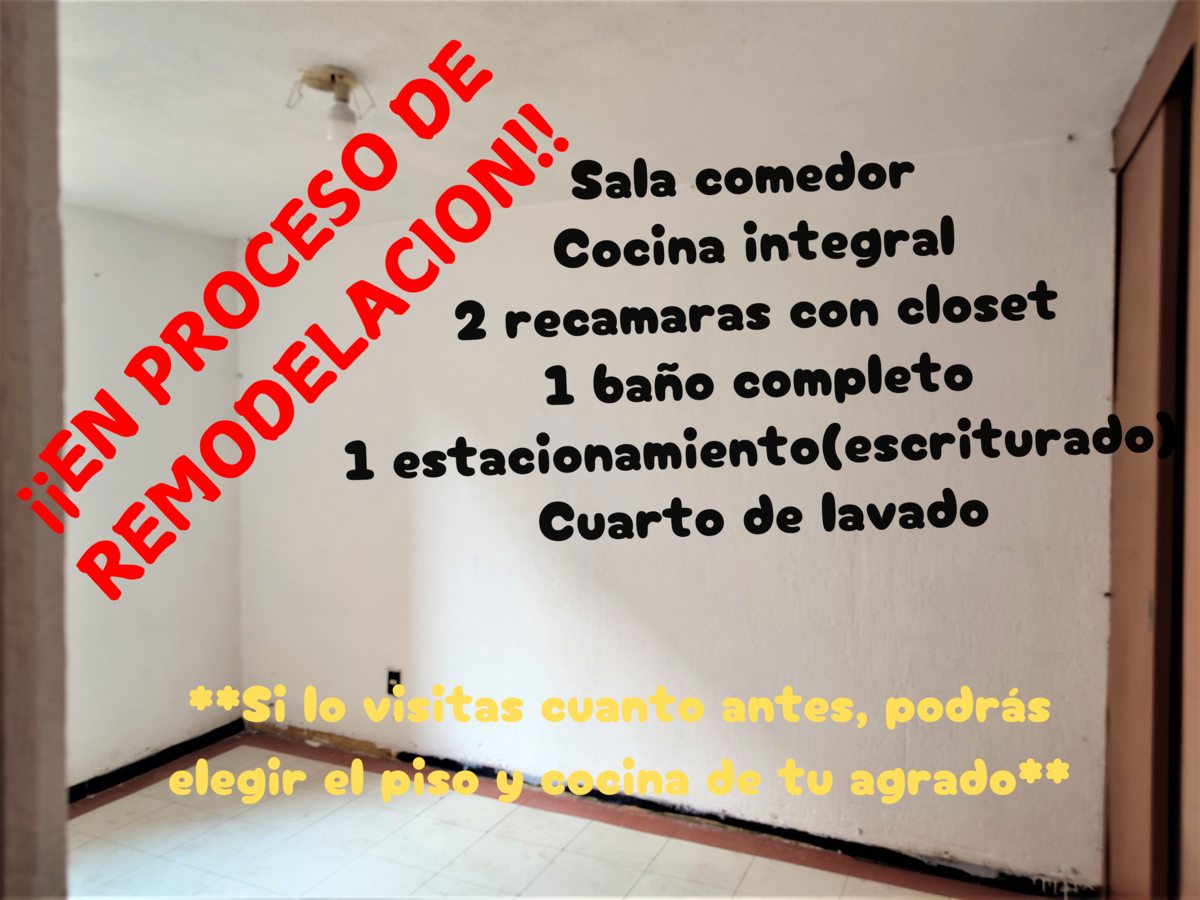 DISTRIBUCION DE ESPACIOS: sala-comedor, cocina integral, 2 habitaciones con clóset cada una, 1 baño completo, cuarto de lavado y 1 CAJON DE ESTACIONAMIENTO PRIVADO Y EXCLUSIVO