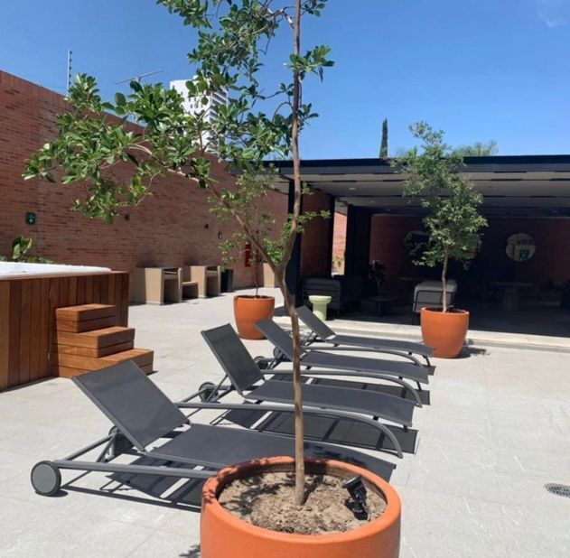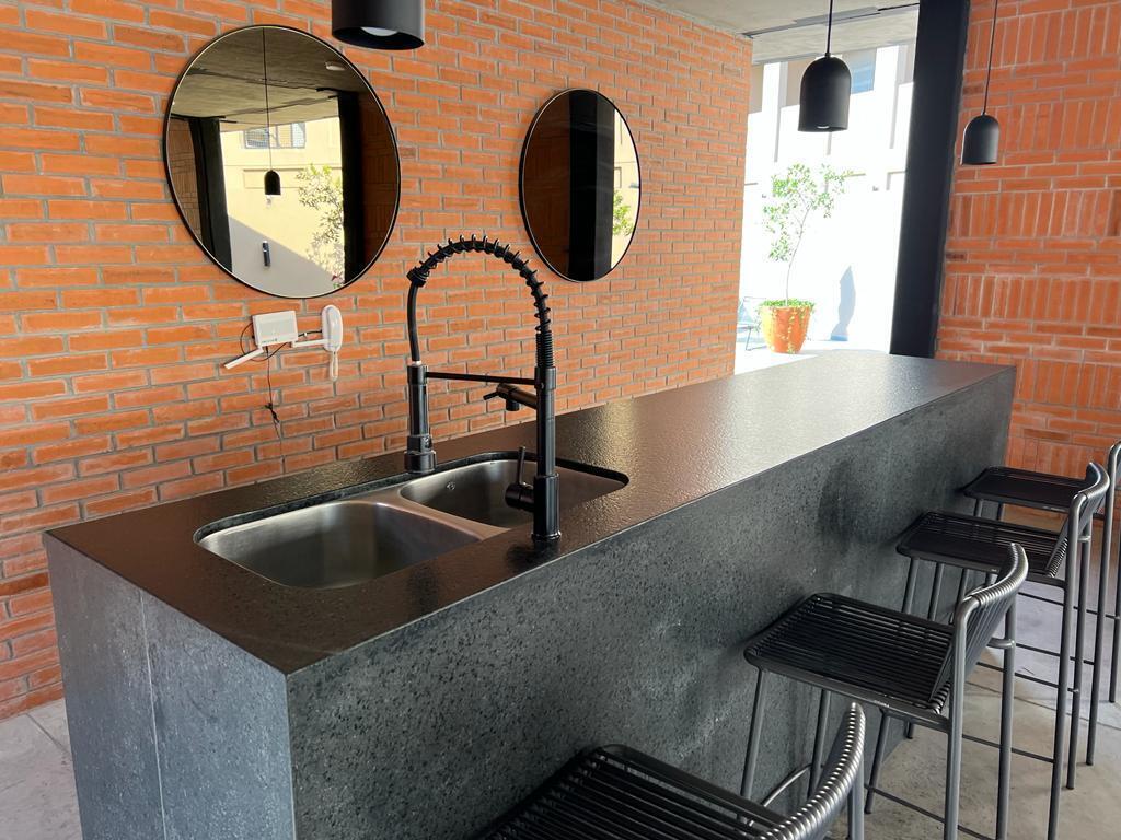 - Área de estar al aire libre con mesas, sillas, fregadero para eventos