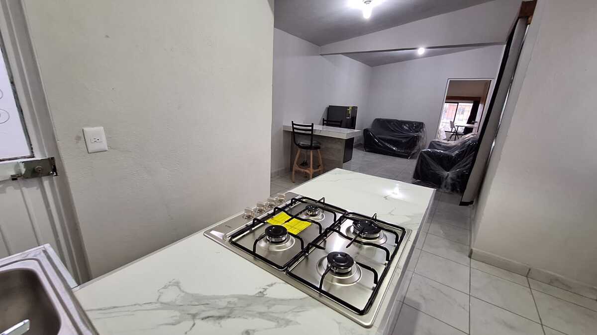 Consta de dos amplias recámaras, sala-comedor con cocineta, baño completo, y patio pequeño. Con muebles de sala, barra desayunadora, recámaras, refri, estufa, y todo con protecciones y listo para ocuparse.