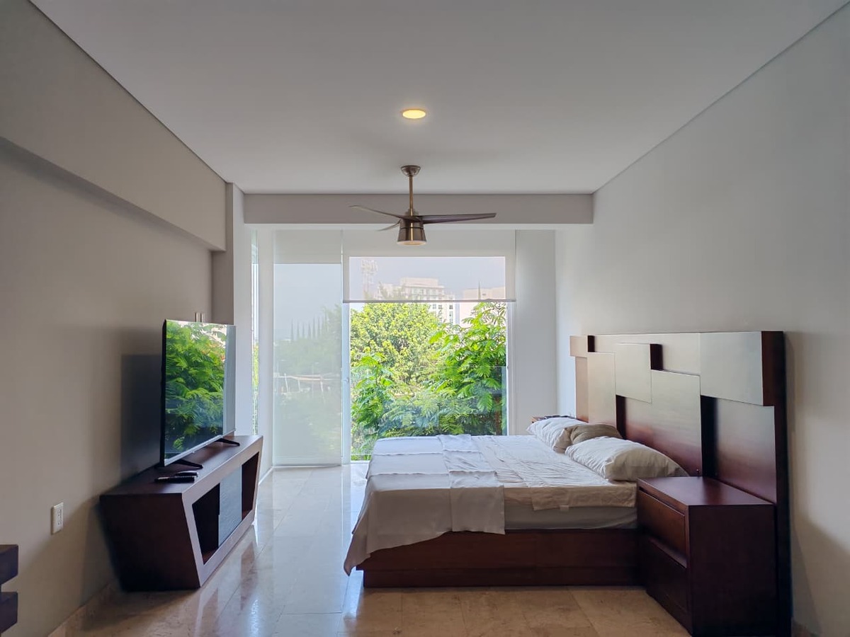Departamento amueblado; piso de mármol, ventiladores de techo y cortinas.