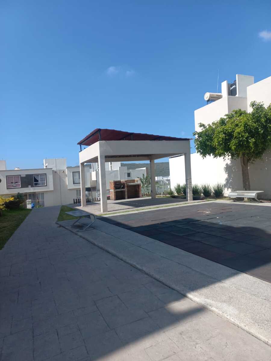 Pequeña privada con acceso controlado, palapa, estacionamiento de visitas y área de juegos.