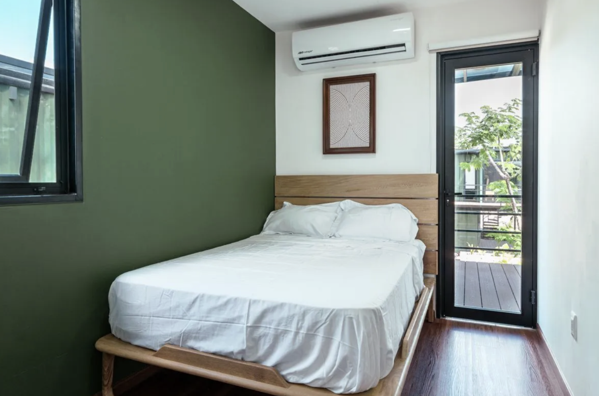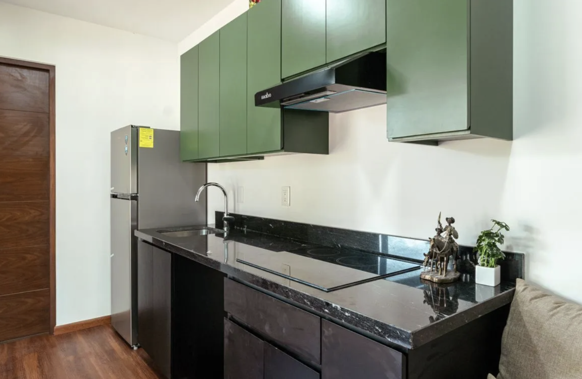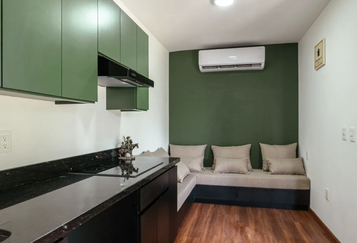 - Cocina/Sala con parrilla eléctrica, extractor, refrigerador y aire acondicionado.