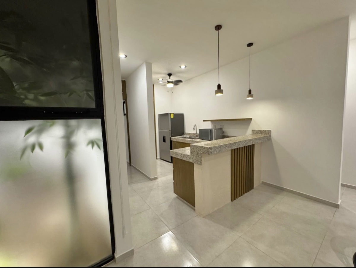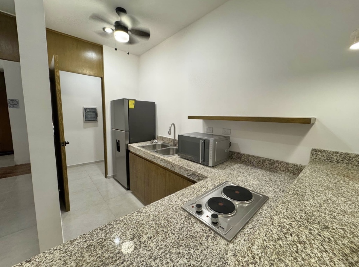 La cocina en open concept, está equipada con refrigerador, estufa eléctrica de 2 quemadores, horno de microondas.