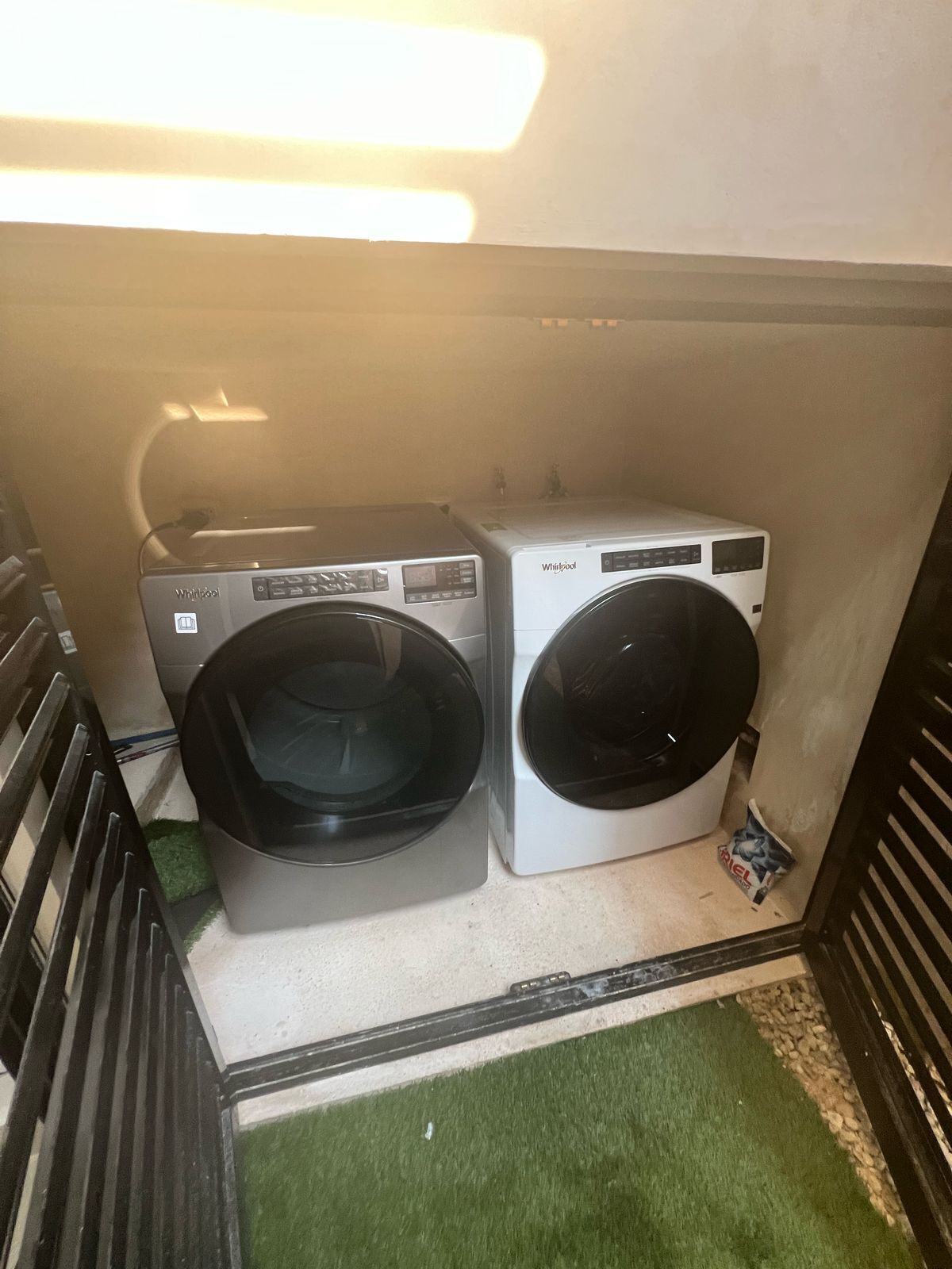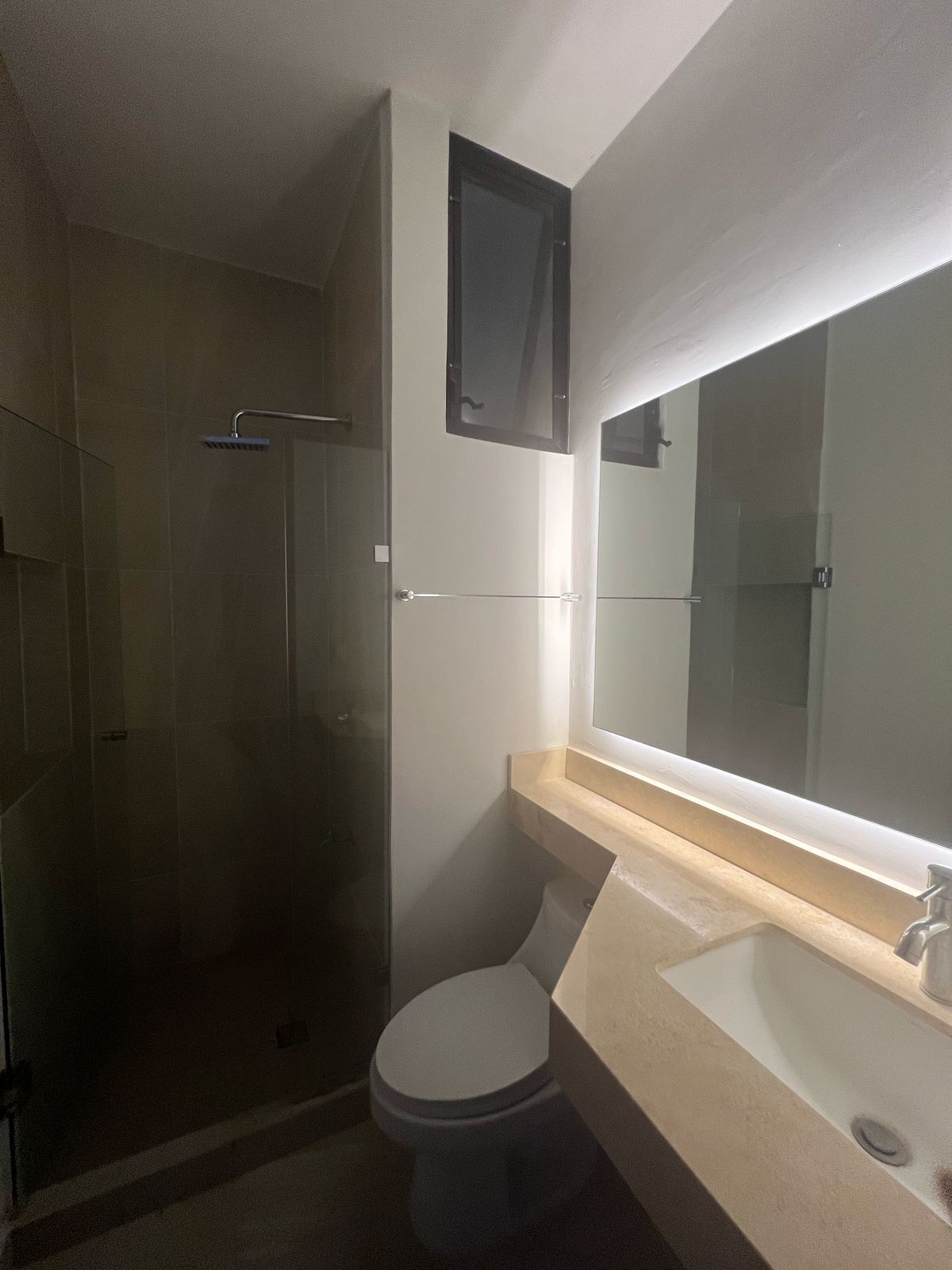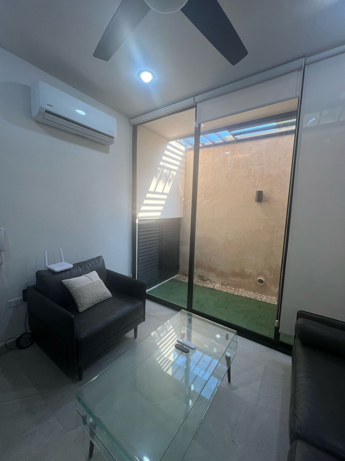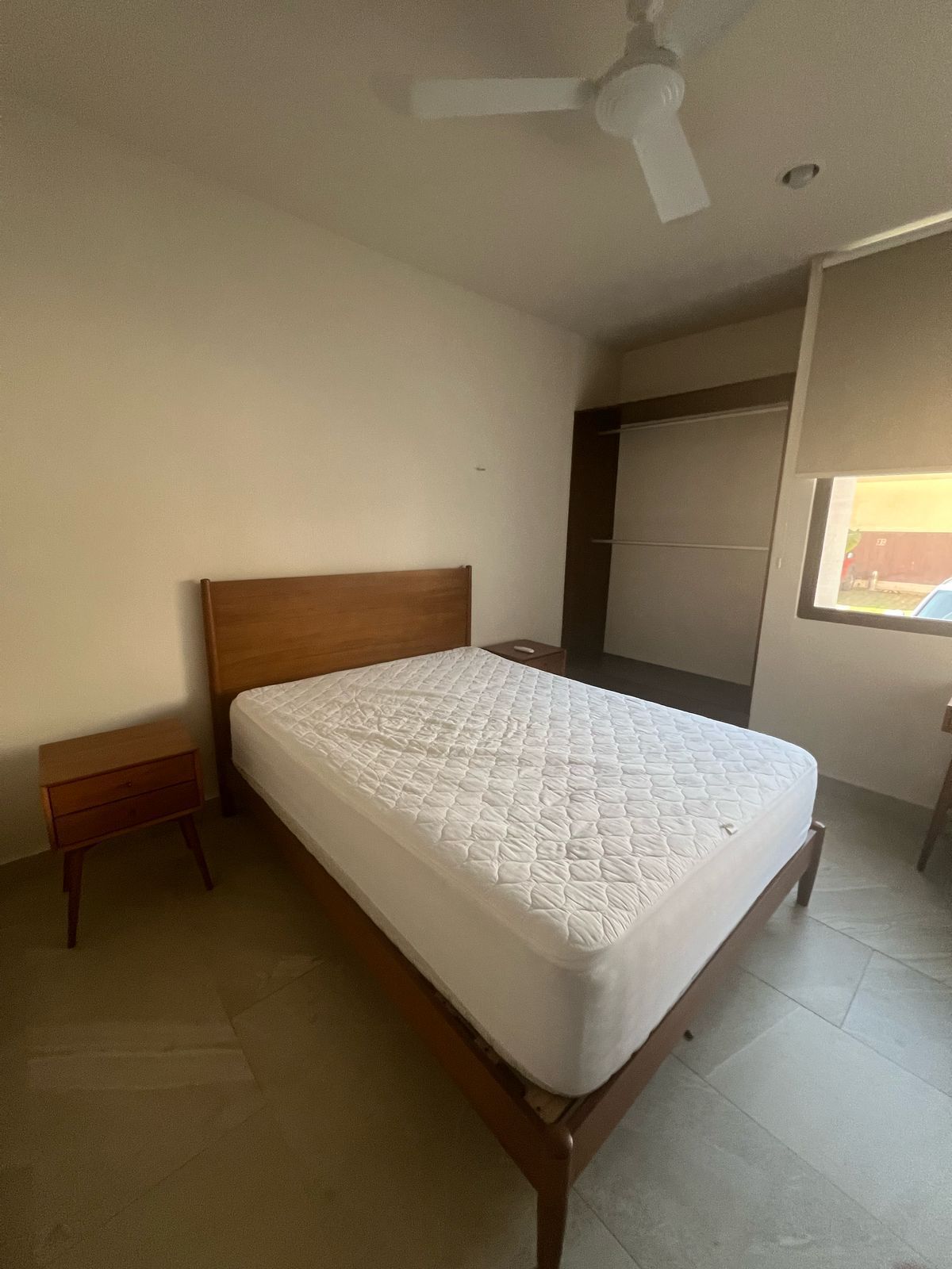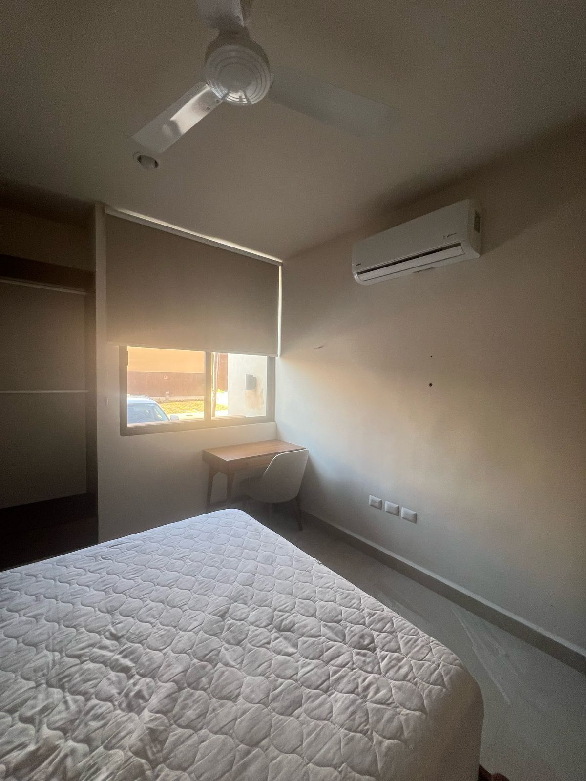 La recámara está amueblada con todo lo necesario, y el espacio está climatizado con aires acondicionados y abanicos para mayor comodidad. Además, incluye una lavadora y secadora, así como un baño completo, ofreciendo todo lo necesario para una estancia cómoda y funcional, así como un cajón para estacionamiento.