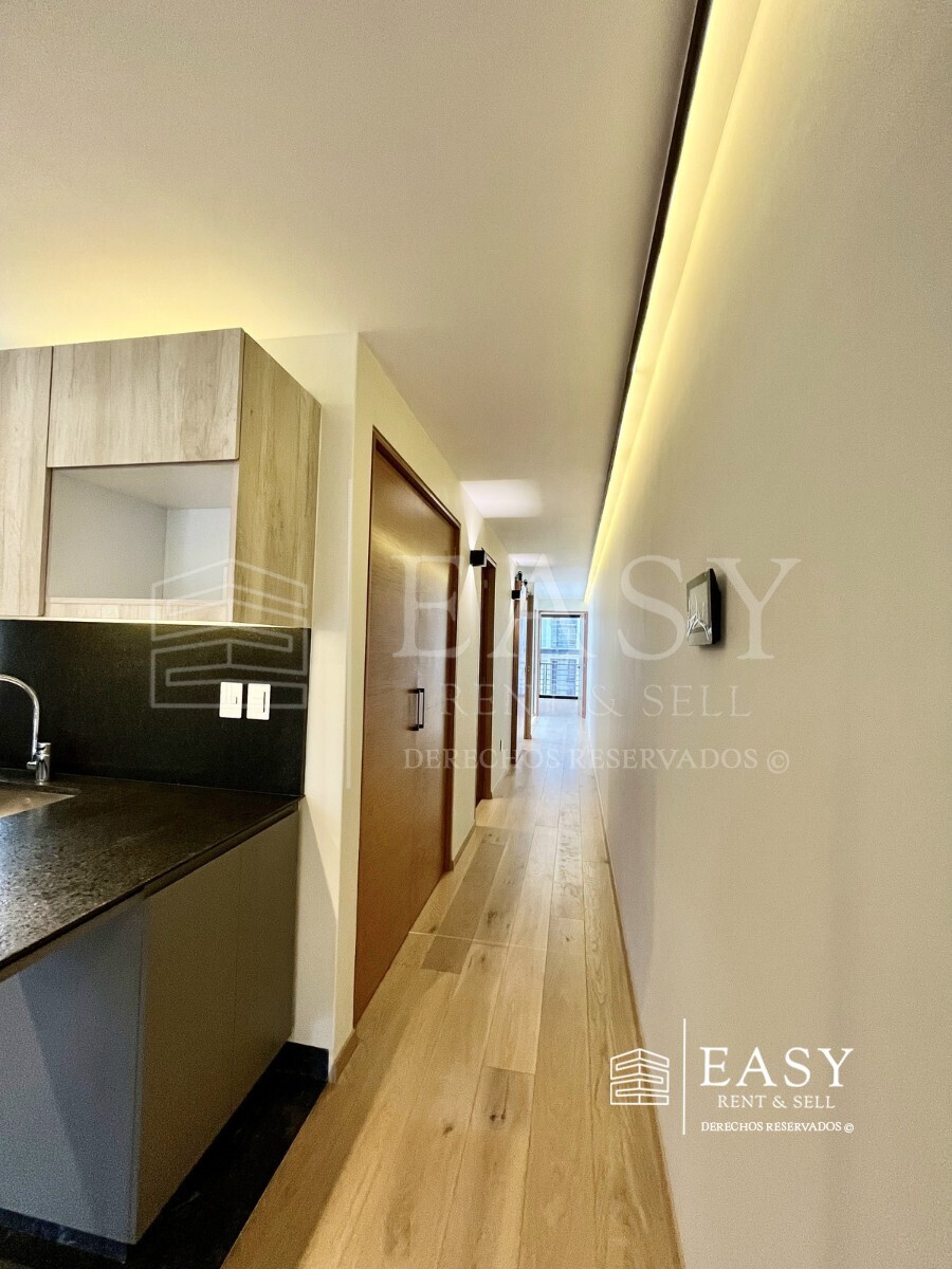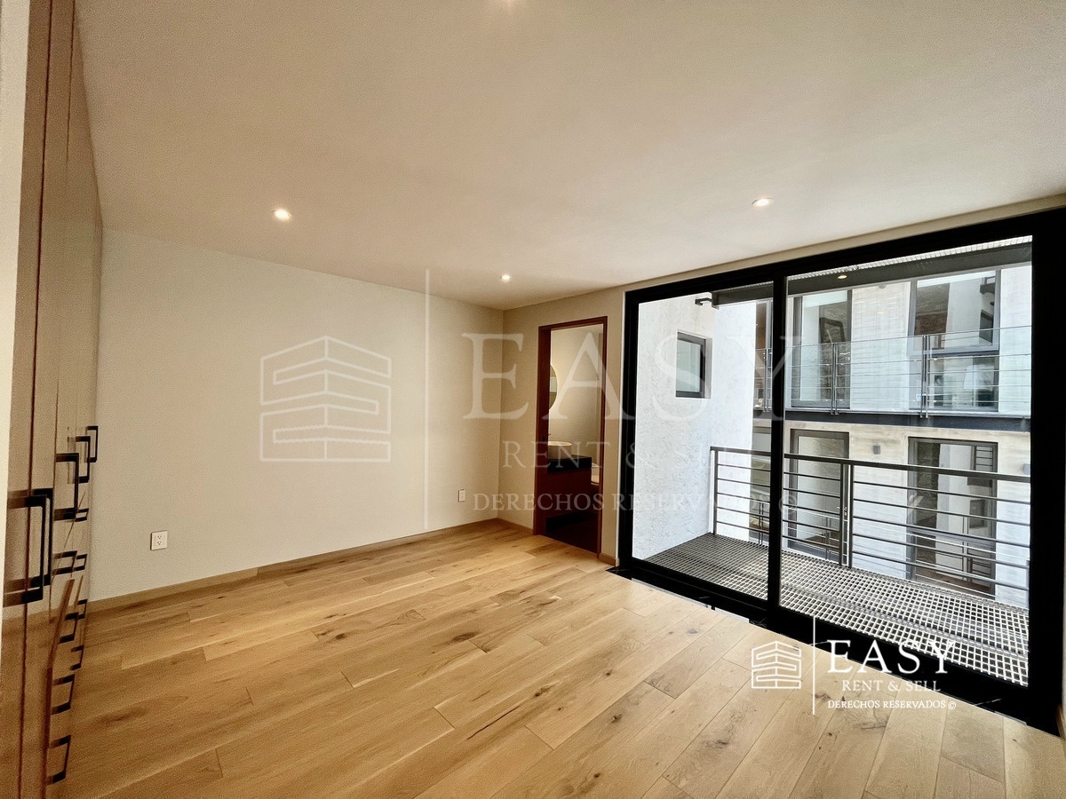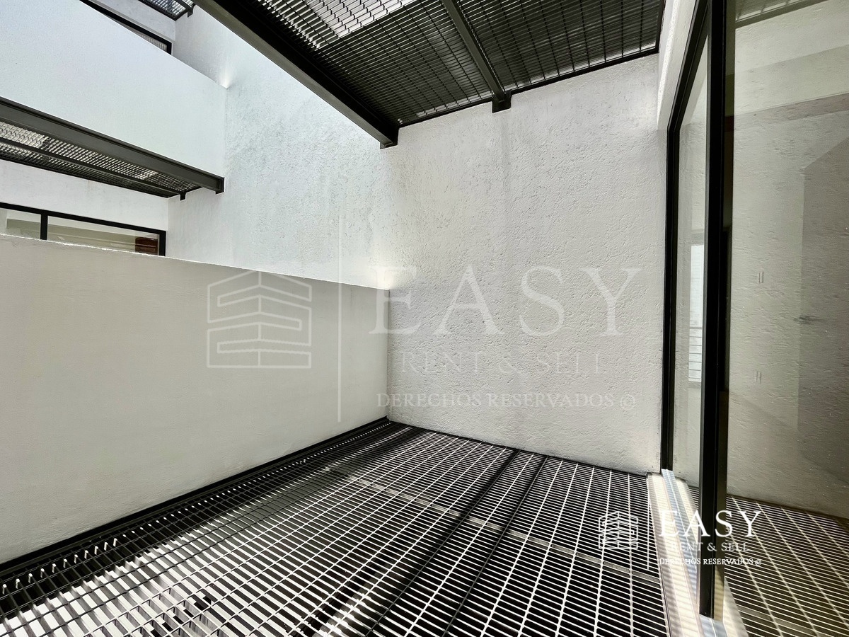 Apartment for rent located on a tree-lined and low-traffic street in the Condesa neighborhood. It consists of 110 m2, which includes a spacious living room that is very naturally lit with access to a terrace that connects to the living room, an open kitchen with San Gabriel Leather granite countertops, a laundry area, a full bathroom covered with large-format porcelain and anti-slip tiles, a secondary bedroom with access to the terrace, and a master bedroom with a full bathroom, large closet, and access to a private terrace. The entire apartment is finished with luxury materials, has plenty of natural light, and an excellent layout. Additionally, it includes 1 parking space and 24-hour security, as well as a security monitor where you can see the camera at the main entrance of the building.