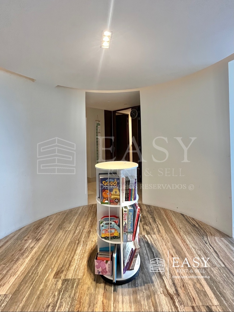 The apartment is equipped with air conditioning in the living room and blackout and translucent electric blinds in all areas. It consists of 179 square meters of living space, which includes a guest bathroom and foyer, a spacious living room, semi-open kitchen, and service room. In the private area, there is a family room or study and three bedrooms, each with a full bathroom. The master bedroom bathroom has a tub.