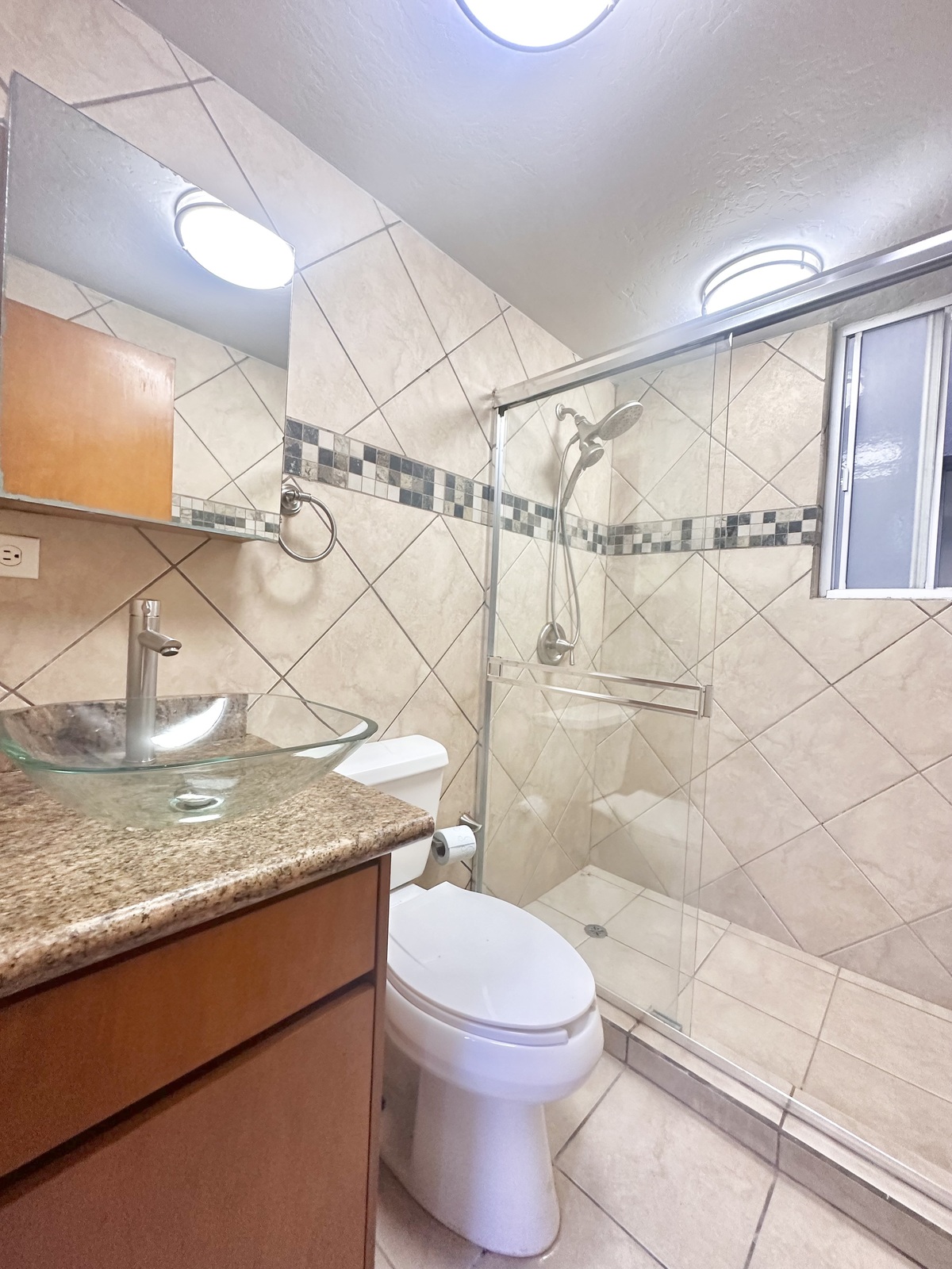 - 1 Full bathroom with glass partition.