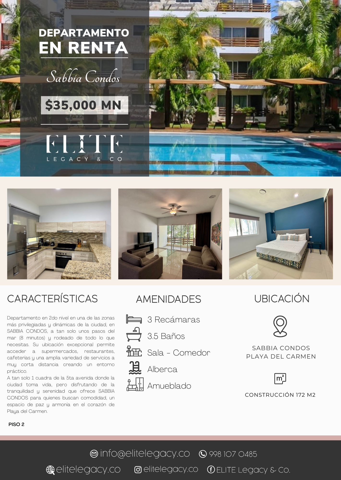Apartment on the 2nd level in one of the most privileged and dynamic areas of the city, in SABBIA CONDOS, just a few steps from the sea (8 minutes) and surrounded by everything you need. Its exceptional location allows access to supermarkets, restaurants, cafes, and a wide variety of services at a very short distance, creating a practical environment. Just 1 block from 5th Avenue where the city comes to life, but enjoying the tranquility and serenity that SABBIA CONDOS offers for those seeking comfort, a space of peace and harmony in the heart of Playa del Carmen.