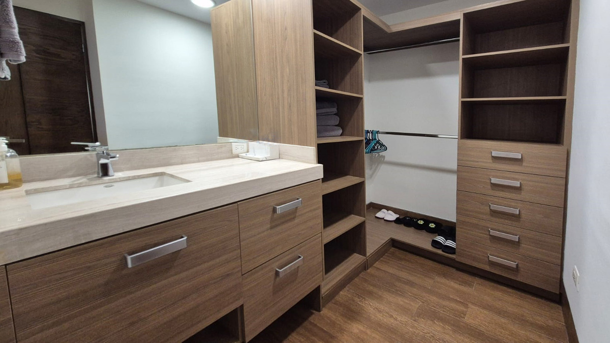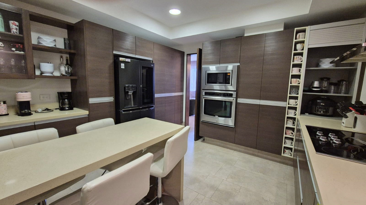 Amplia sala y comedor con balcón, medio baño, cocina con barra desayunadora, family room, closet de blancos, lavandería y cuarto de servicio.