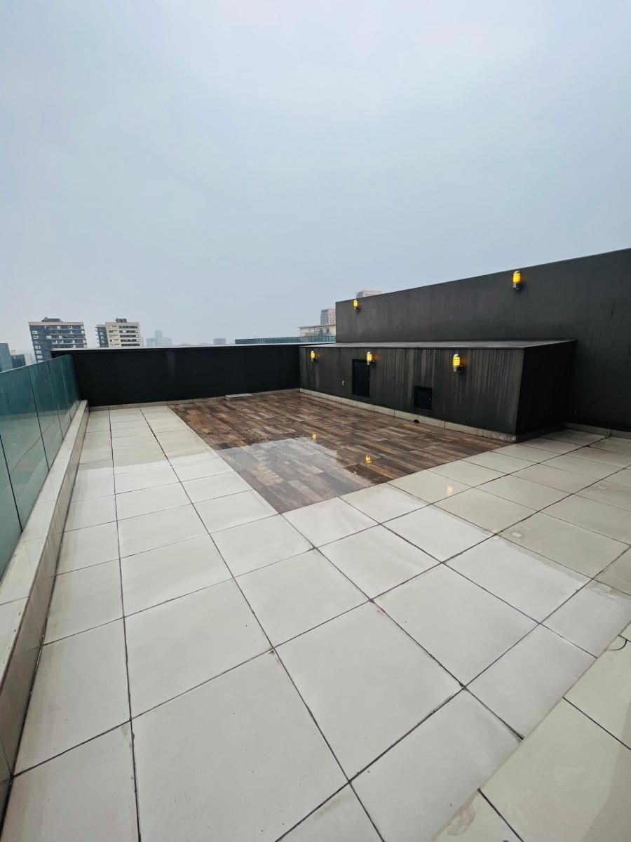 Maintenance included.Hermoso departamento con terraza en renta en Torre Estocolmo, Polarea. Consta de 160m2, 3 recamaras, 2 baños completos, sala, comedor, cocina, cuarto de lavado, 1 terraza de 60m2, 2 lugares de estacionamiento.