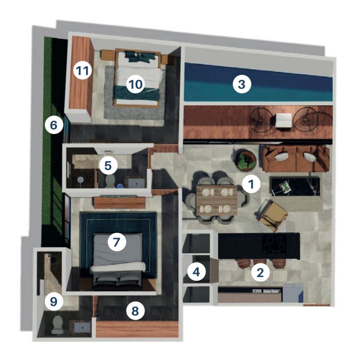 *This is a render that may vary from the actual result.*Precioso y amplio departamento en renta, ubicado en Temozón Norte, Mérida. Exclusiva zona residencial a tan solo 5 minutos de plaza La Isla, Cabo Norte, Centros Comerciales y Universidades como La Marista, UVM y Anáhuac Mayab.