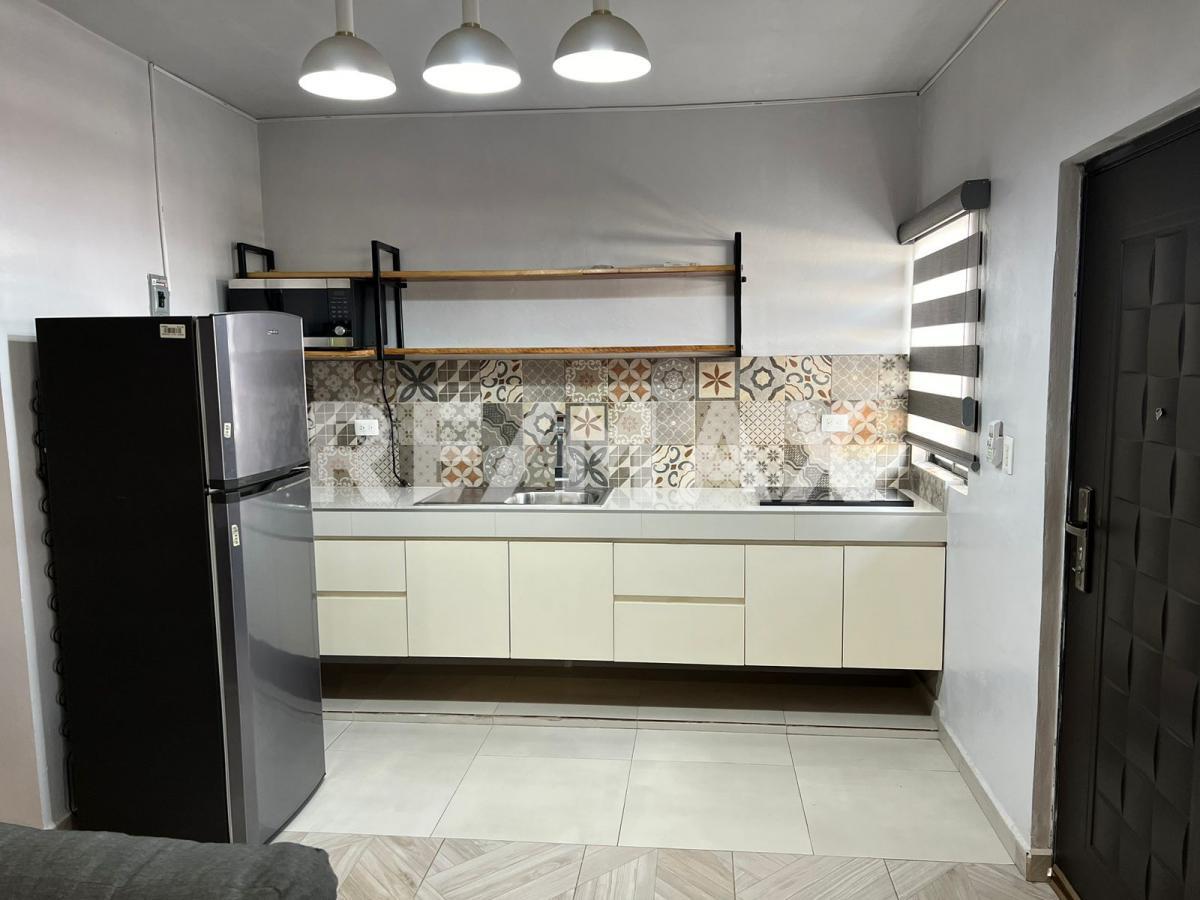 Cocina equipada con refrigerador, estufa eléctrica, microondas.