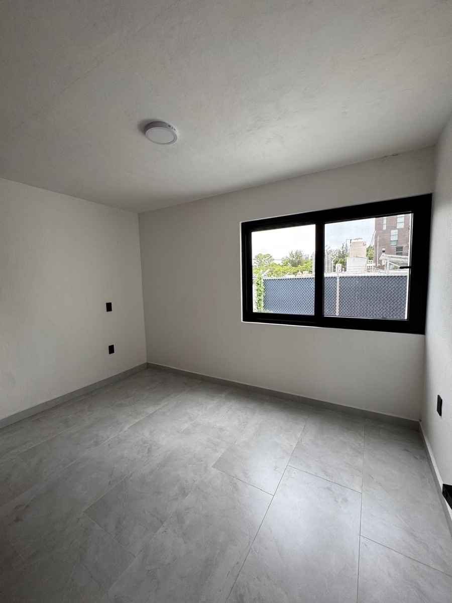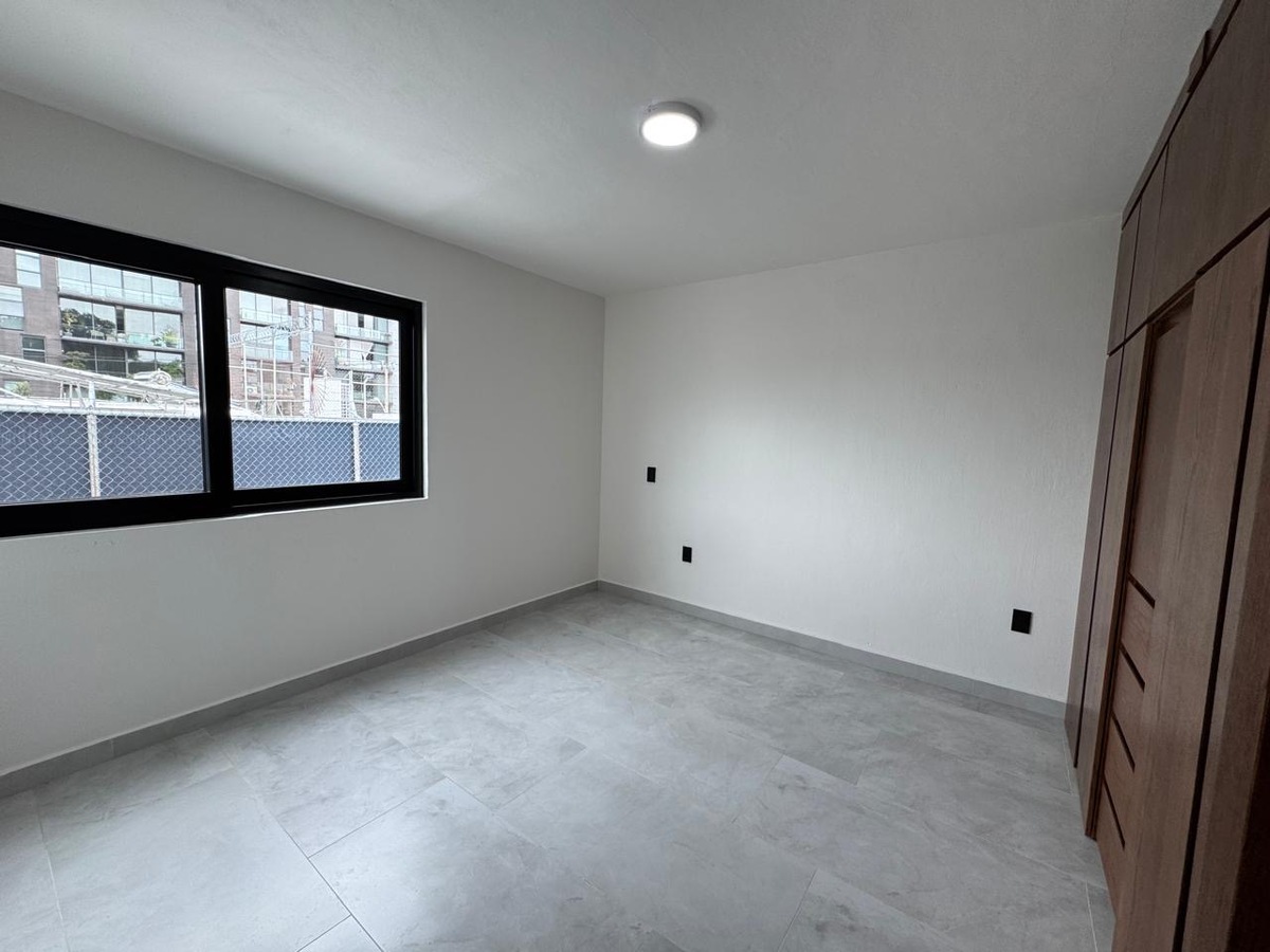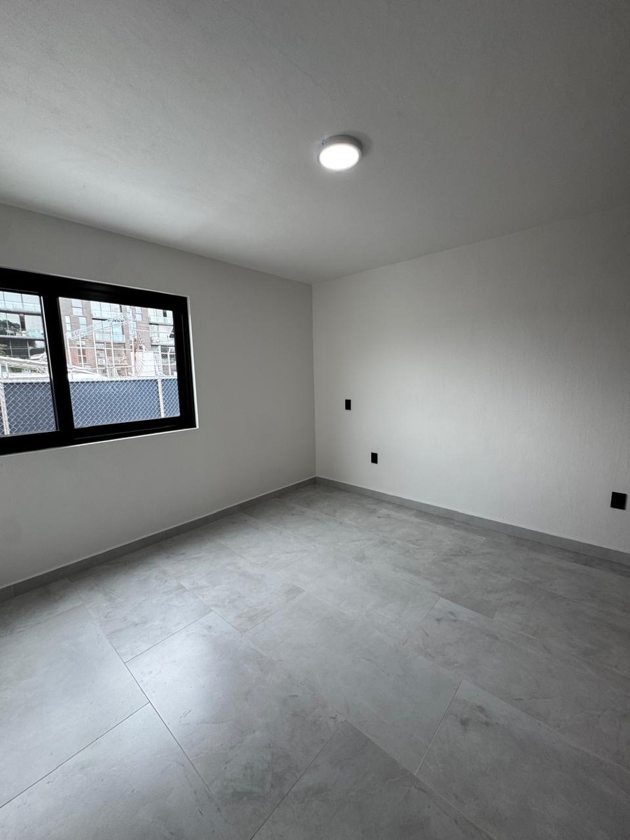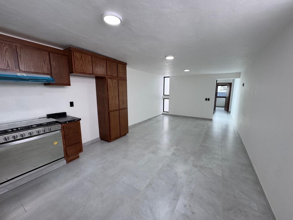 Este departamento destaca por su diseño moderno y acabados de calidad, como se aprecia en la cocina integral con gabinetes de madera oscura y cubierta de granito, así como en el baño con acabados tipo mármol y cancel de vidrio. La iluminación natural se potencia con un tragaluz en la entrada principal.
