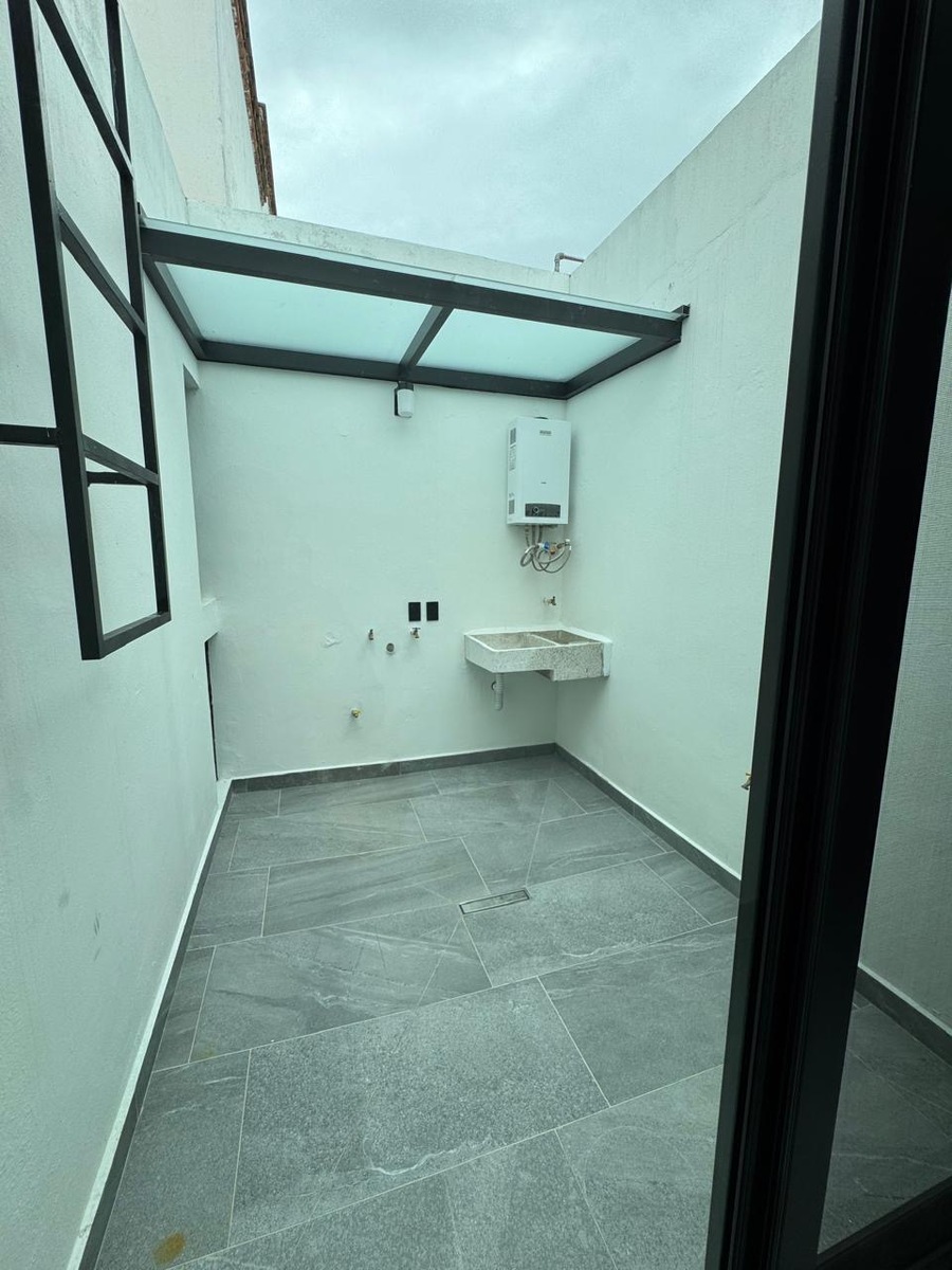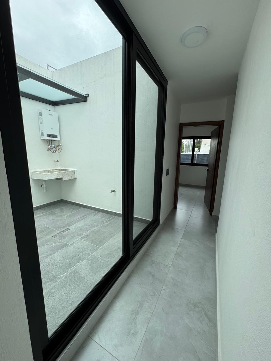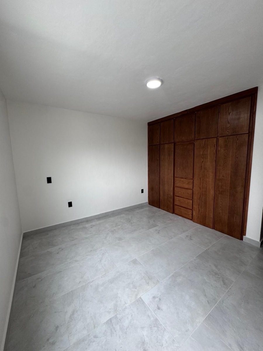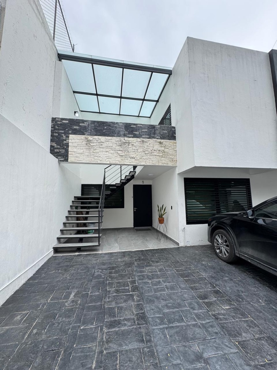 Este departamento destaca por su diseño moderno y acabados de calidad, como se aprecia en la cocina integral con gabinetes de madera oscura y cubierta de granito, así como en el baño con acabados tipo mármol y cancel de vidrio. La iluminación natural se potencia con un tragaluz en la entrada principal.
