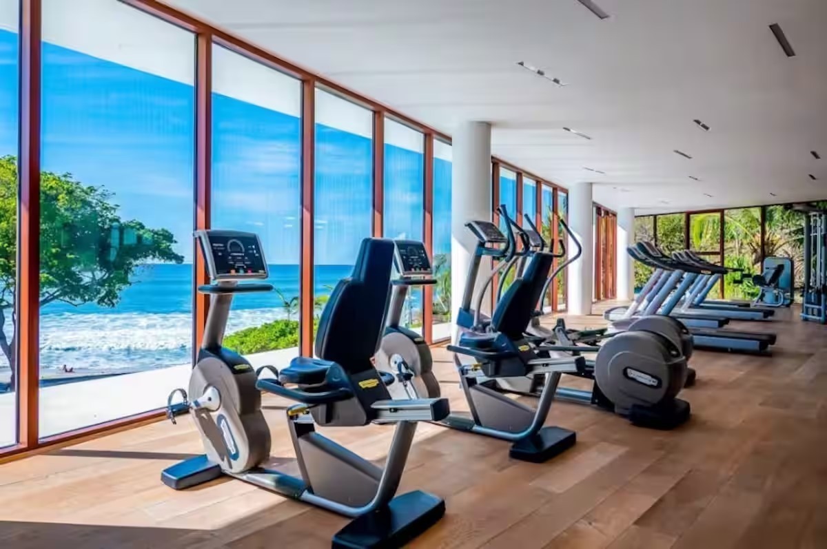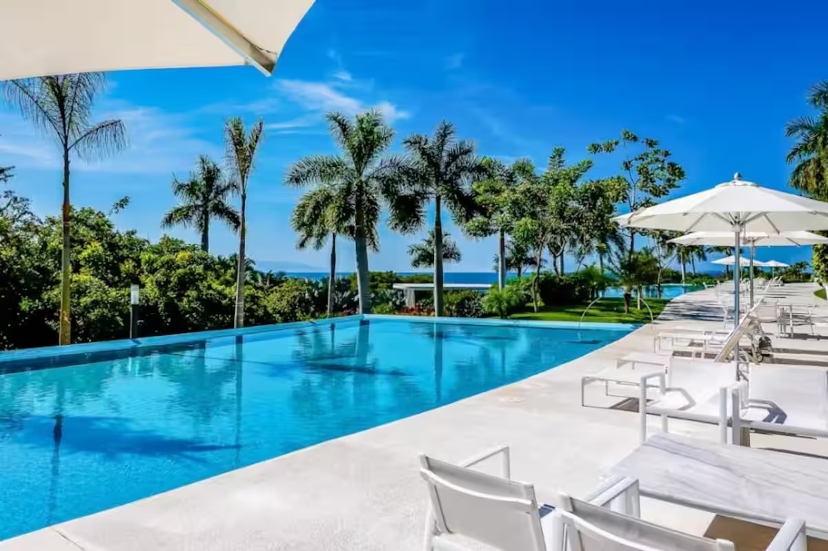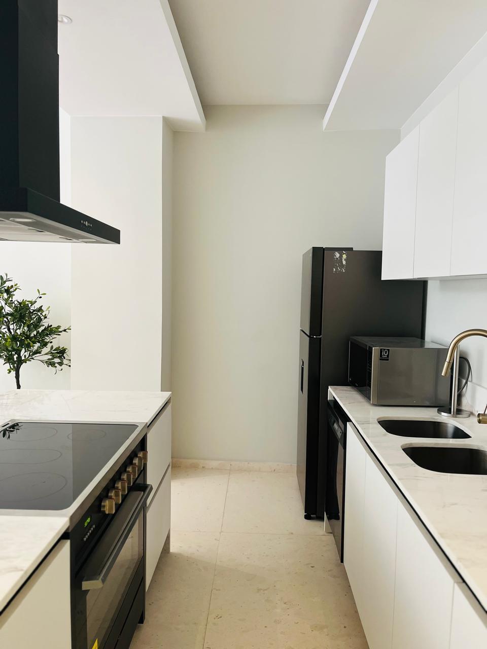 La cocina, de diseño contemporáneo, cuenta con cubiertas residenciales, acabados en alto brillo, parrilla de inducción y campana extractora, proporcionando un espacio funcional y sofisticado. La estancia principal se abre a amplios balcones con vistas exclusivas a la Bahía de Banderas, permitiendo disfrutar de un entorno privilegiado.