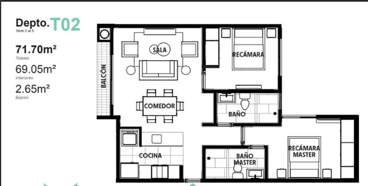 Este es un departamento INTERIOR pero iluminado distribuido en un espacio de 69.05m2 de interiores+2.65 de balcón que contemplan 2 cómodas recámaras, 2 baños completos, cómoda y moderna cocina integral con área de lavado y roofgarden común.