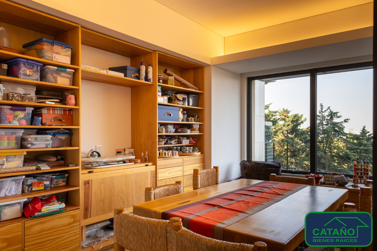 Stunning apartment in BOSQUE 6060, privileged location within a walled forest (70,000 m) with a wonderful view, spacious living room, lounge, dining room that connects to a covered private terrace of 20m, study, TV room, 3 comfortable bedrooms each with a dressing room and bathroom. Service room and laundry integrated into the apartment, covered parking for 3 cars plus visitor parking, storage room, and drivers' room. Excellent amenities, medieval-style clubhouse with furnished rooms for meetings, bar, café service, covered pool, steam room, and sauna, children's playroom, teen lounge, gym, and boxing room. Outside, the common areas consist of two areas with playgrounds, tennis court, outdoor walking track, bike path, wooded gardens, concierge service, and 24-hour security.