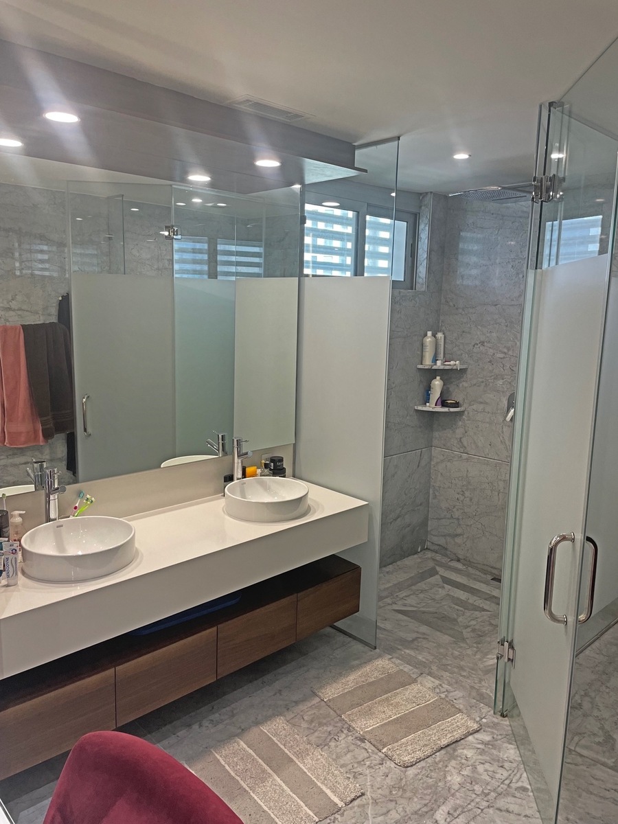 - 3 recamaras con baños completos completos y walk-in closets , con acabados de mármol y duela de fresno.