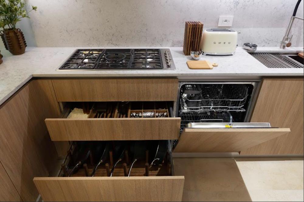 Cocina italiana con refrigerador panelado, horno microondas, horno, parrilla, campana y lavavajillas panelado SMEG.