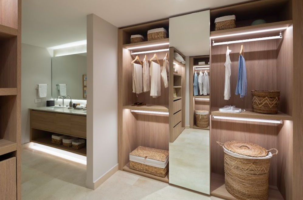 Closets con repisas reforzadas e iluminación led y espejo en recámara principal.