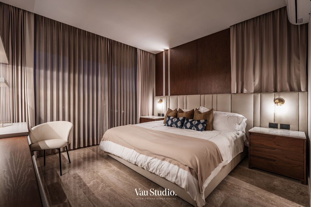 Recámara principal con closet vestidor y baño completo.
