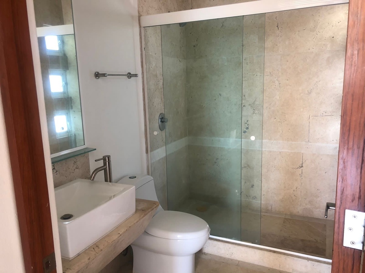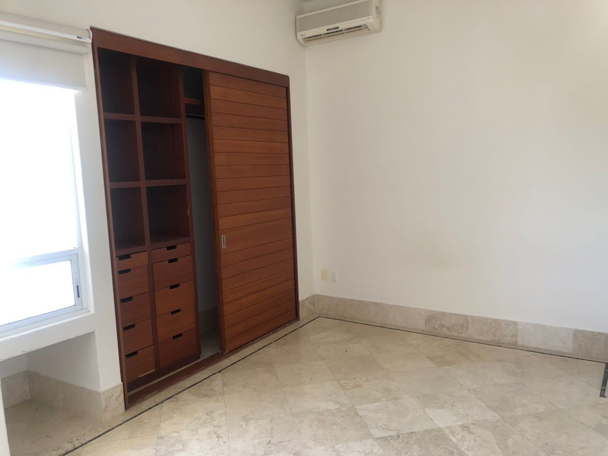 Tiene 152 metros cuadrados, terraza, estancia sala comedor, espacio abierto para sala de tv, 2 recámaras, 3 baños completos, 2 de ellos en cada recámara, la recámara principal con vestidor, la otra con closet, cocina equipada, cuarto de servicio integrado con baño completo, espacio de lavado, totalmente encortinado y con aire acondicionado en cada habitación. El departamento cuenta con 2 cajones de estacionamiento.