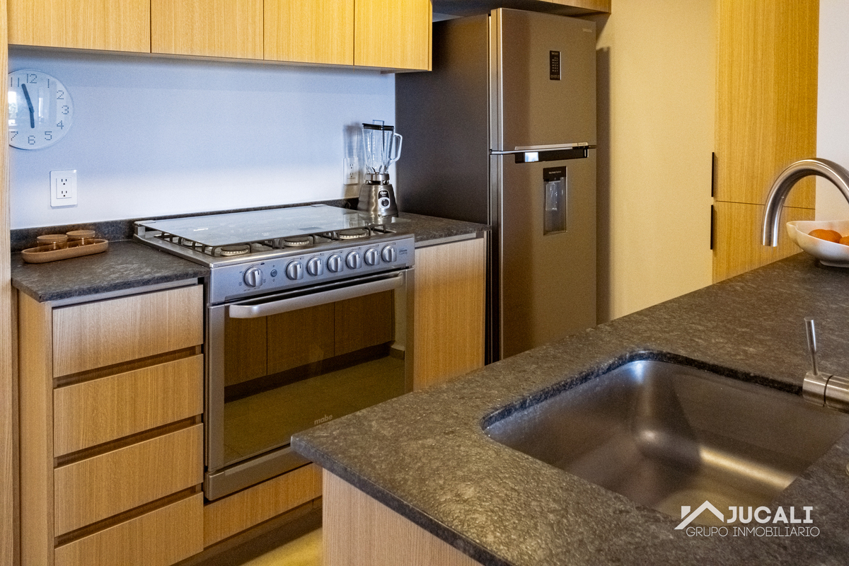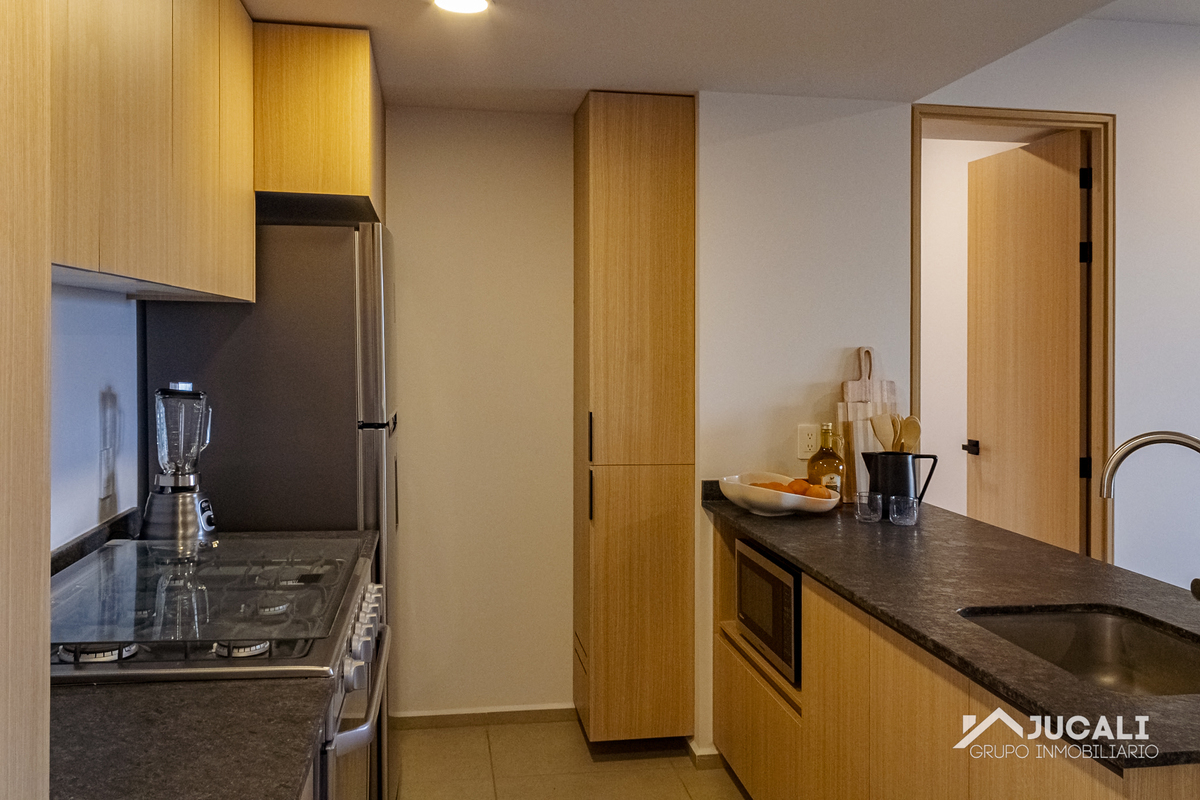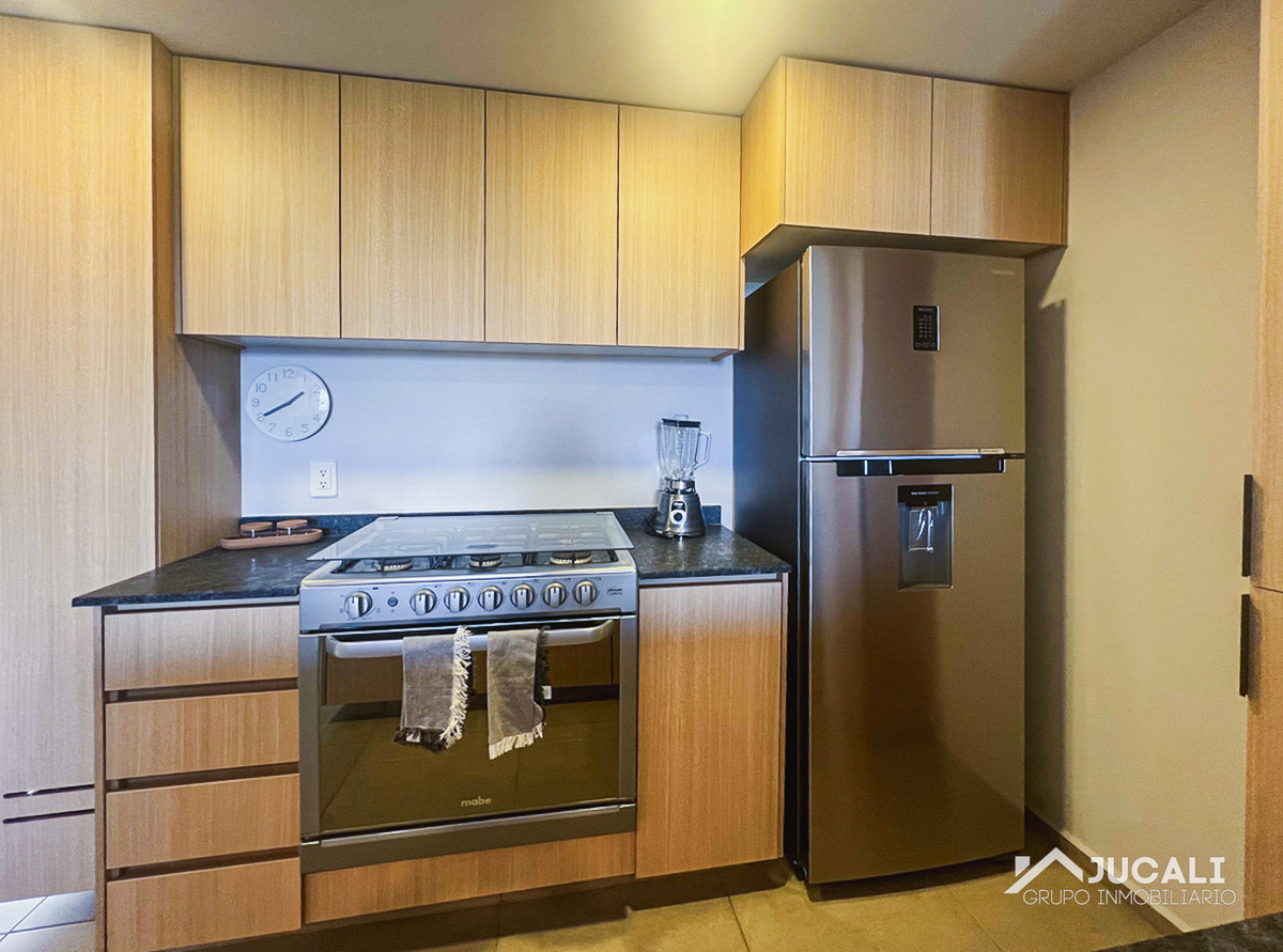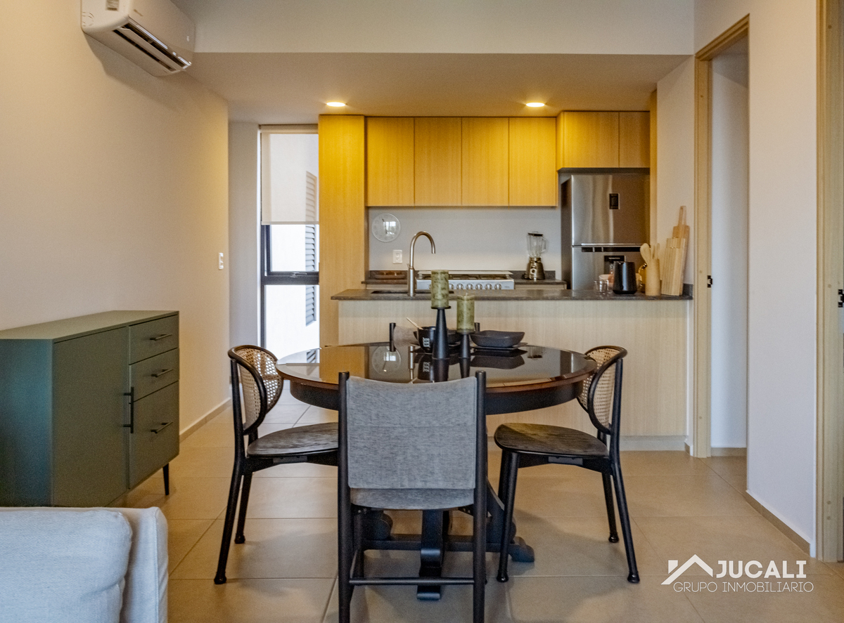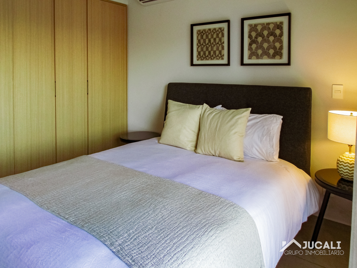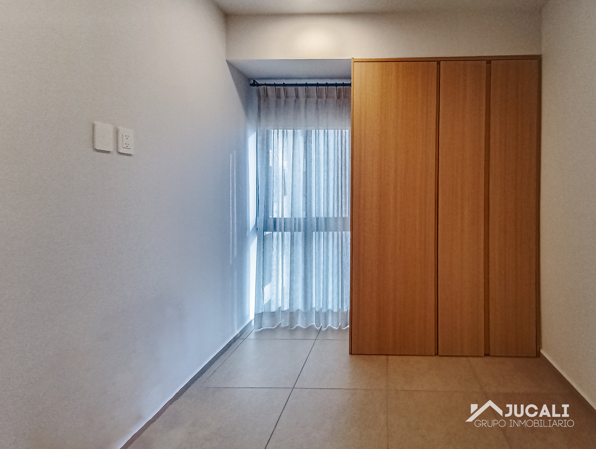 El departamento cuenta con 71.85m2, sala, comedor, cocina integral con barra, área de lavado, balcón, medio baño, recamara con closet, baño, recamara secundaria con closet y bodega.