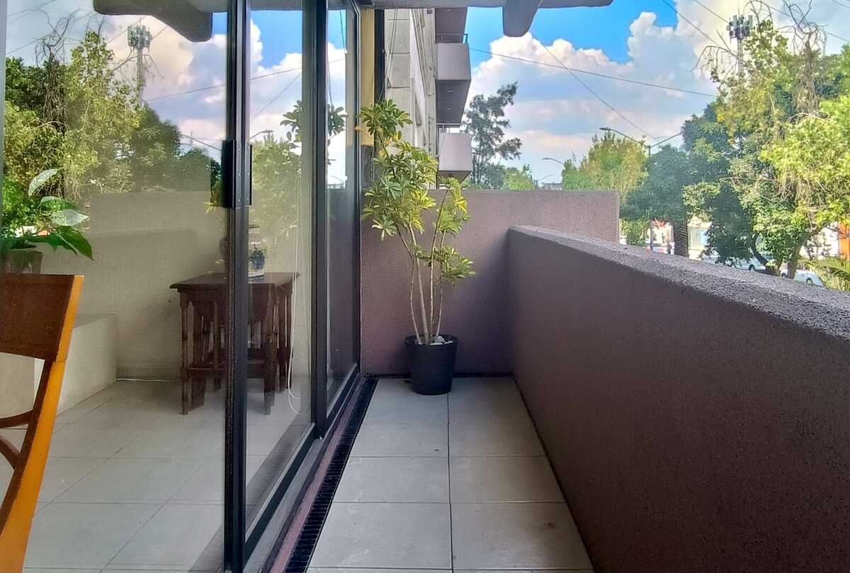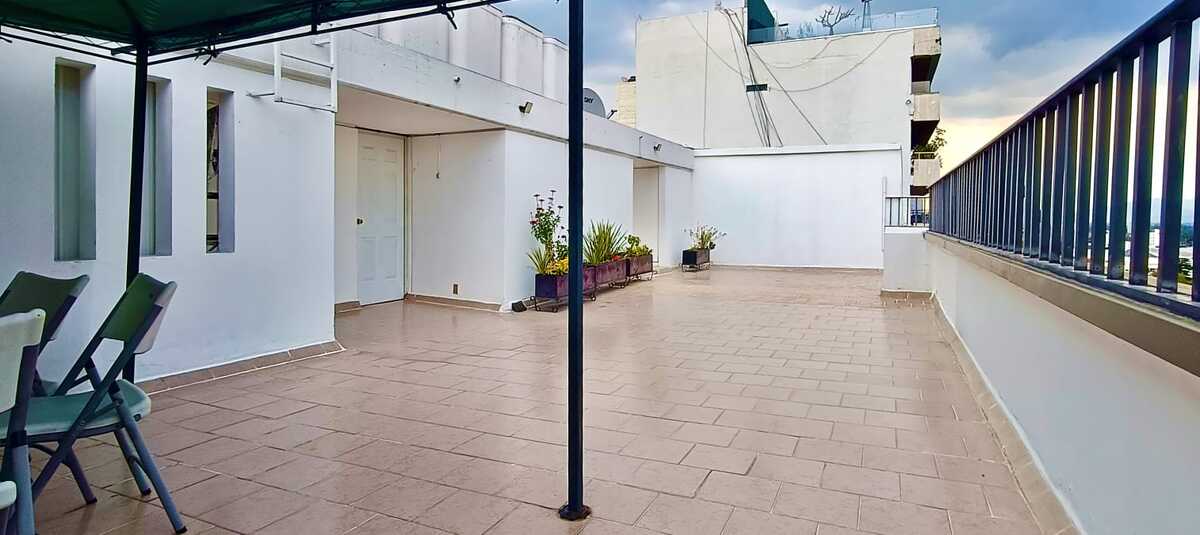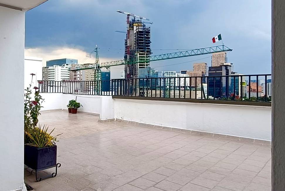 Cuenta con elevador privado, tres amplias recámaras (la principal con vestidor y baño), cocina integral con desayunador, sala de estar o family room, cuarto de servicio con baño, bodega privada y un lugar de estacionamiento (con opción a renta de otro). El edificio dispone de roof garden común equipado para reuniones al aire libre.