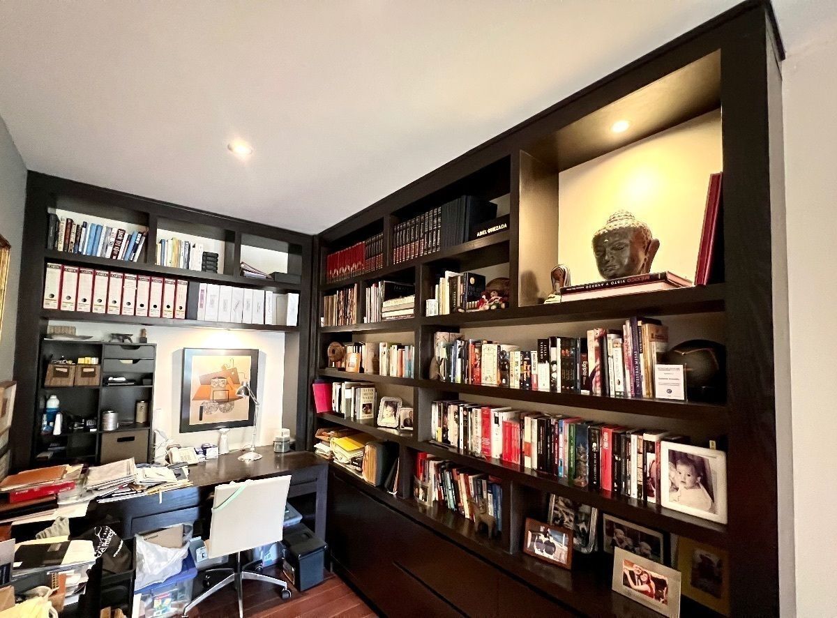 Back in the foyer, to the left we find the guest bathroom and the stairs. Going up, we are welcomed by a warm family room with a large office, three bedrooms, and a TV or family room.