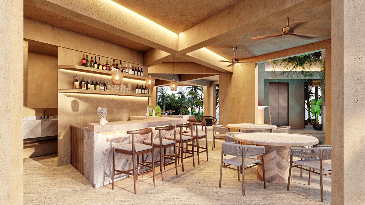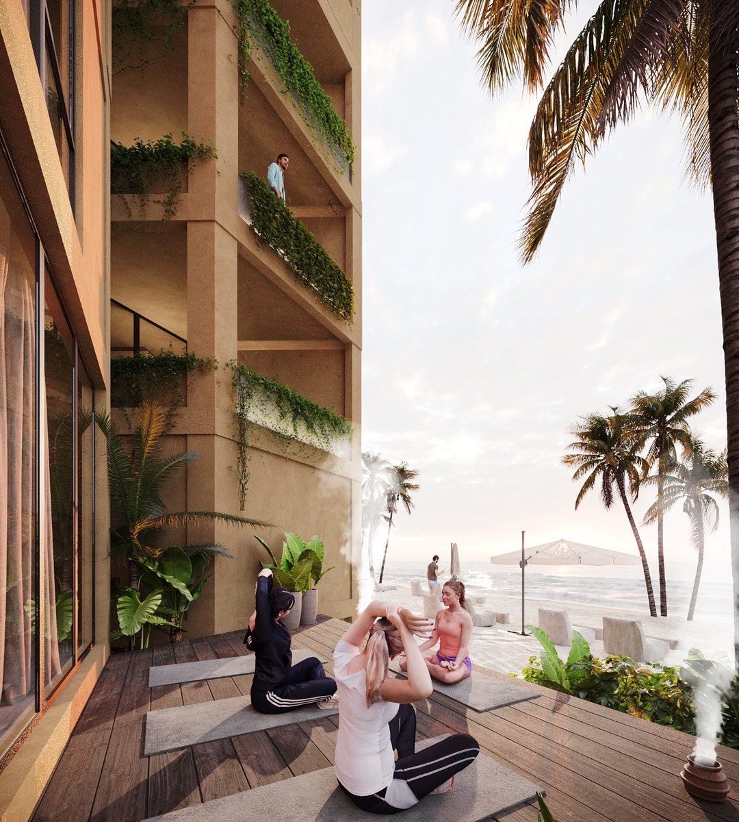 bar, una refrescante área de piscina con camastros, un gimnasio, un mirador con vista litoral en el último nivel y un área oasis de meditación.