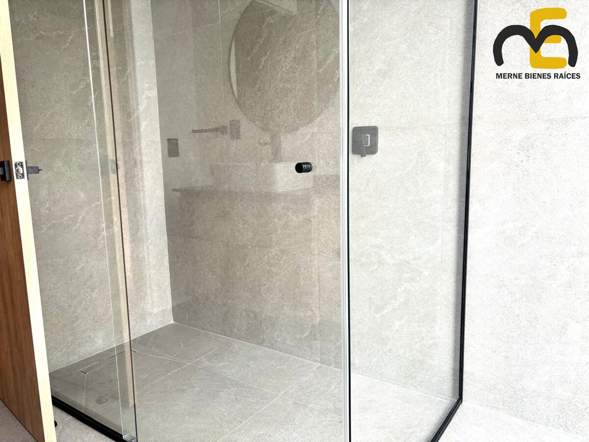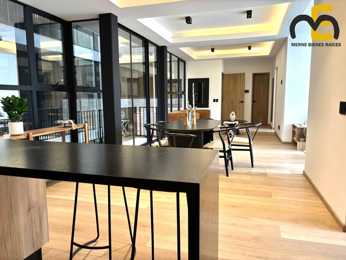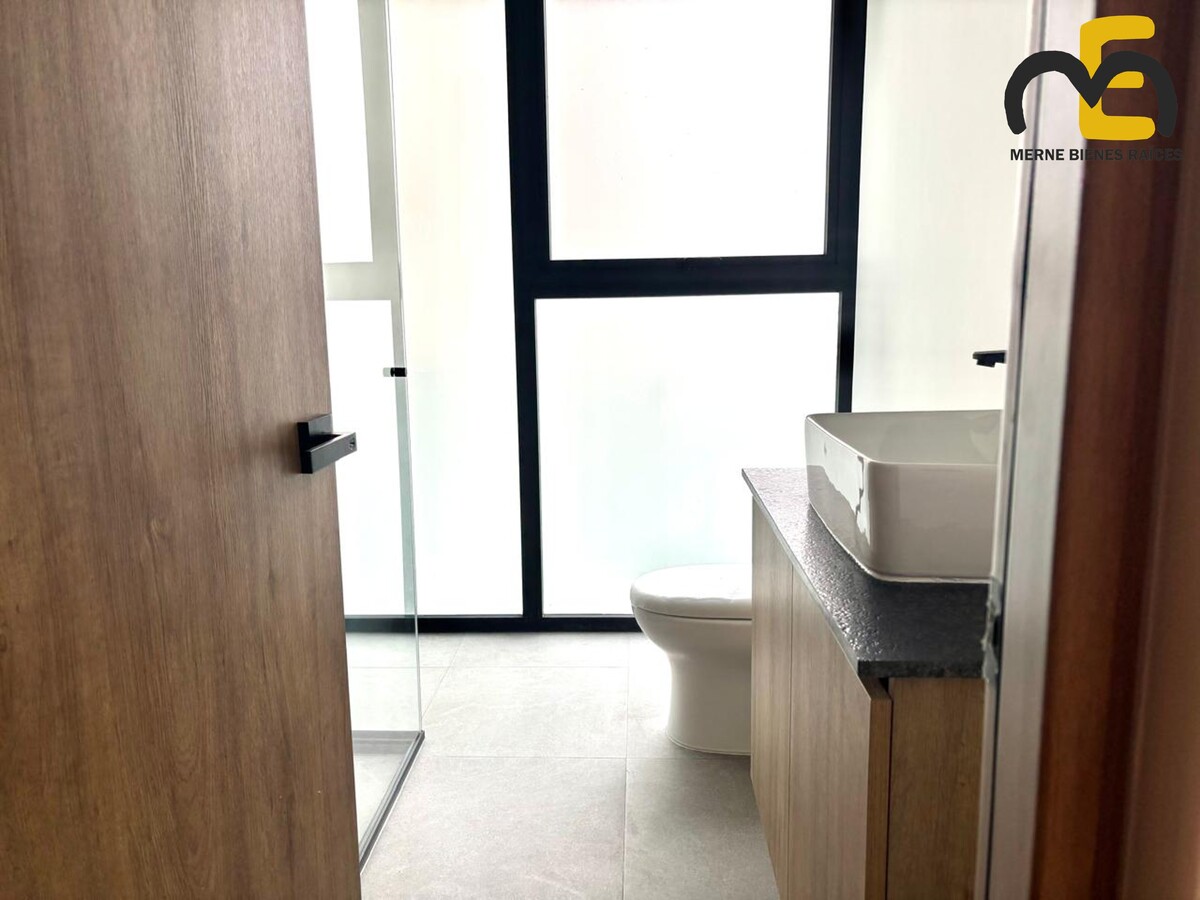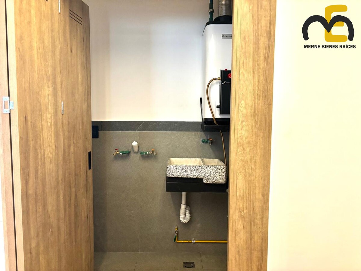 El departamento cuenta con 121 m2, 112m2 habitables y 9 m2 de terraza, 2 recamaras y área de TV que puede adaptarse como una tercera recámara, 2.5 baños, bodega, 2 cajones de estacionamiento. El edificio también cuenta con Roof Garden común, elevador y vigilancia 24 horas, y dos cisternas , línea eléctrica independiente para carga de vehículos eléctricos, Cocina marca IXINA con correderas y bisagras de cierre suave, diseño europeo y elegante. en una zona que cuenta con parques, restaurantes, escuelas, teatros, centros de esparcimiento y entrenamiento, bancos, etc.