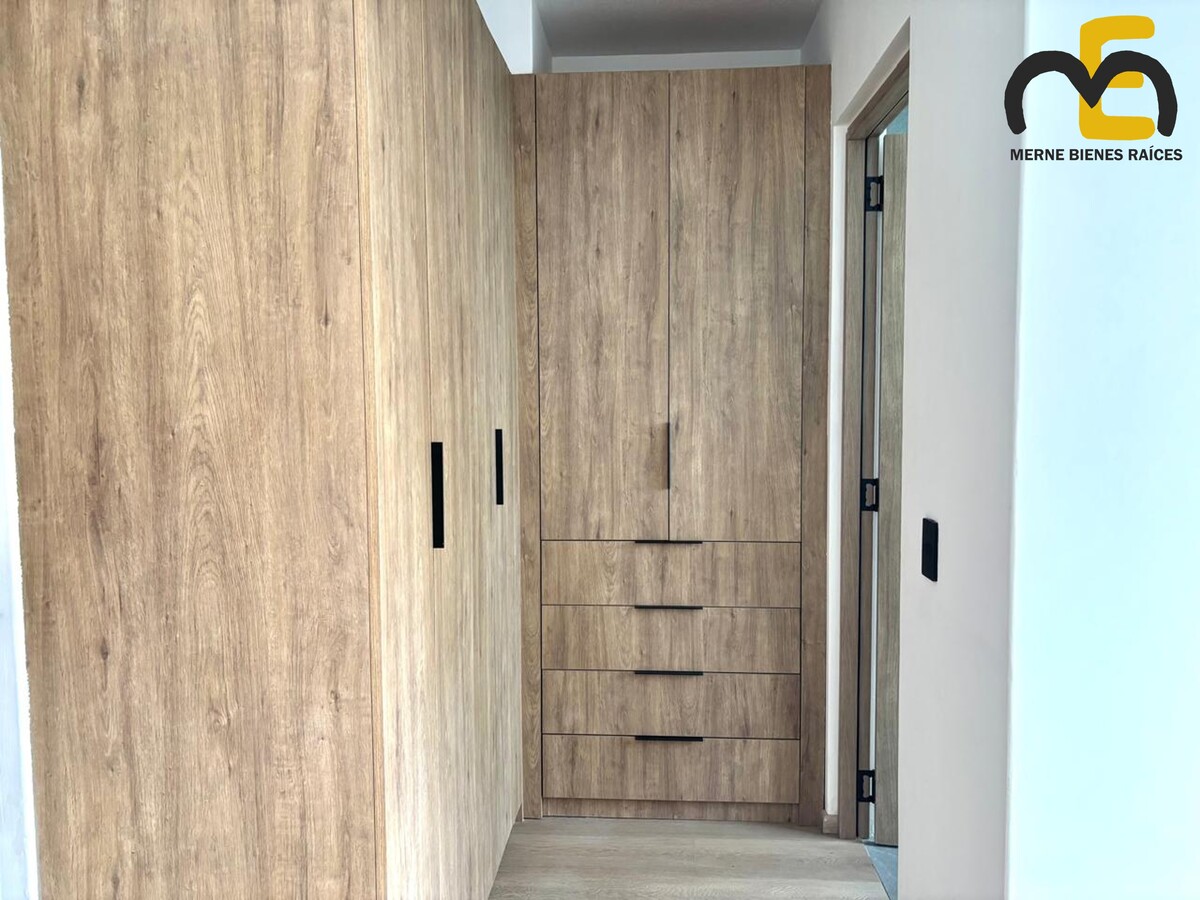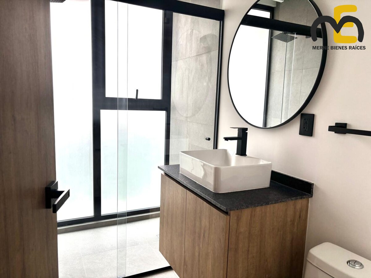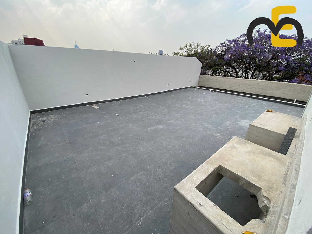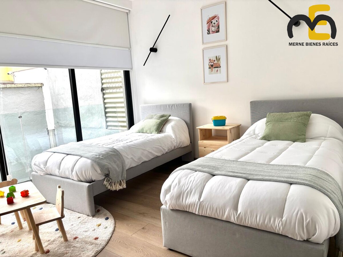 El departamento cuenta con 121 m2, 112m2 habitables y 9 m2 de terraza, 2 recamaras y área de TV que puede adaptarse como una tercera recámara, 2.5 baños, bodega, 2 cajones de estacionamiento. El edificio también cuenta con Roof Garden común, elevador y vigilancia 24 horas, y dos cisternas , línea eléctrica independiente para carga de vehículos eléctricos, Cocina marca IXINA con correderas y bisagras de cierre suave, diseño europeo y elegante. en una zona que cuenta con parques, restaurantes, escuelas, teatros, centros de esparcimiento y entrenamiento, bancos, etc.