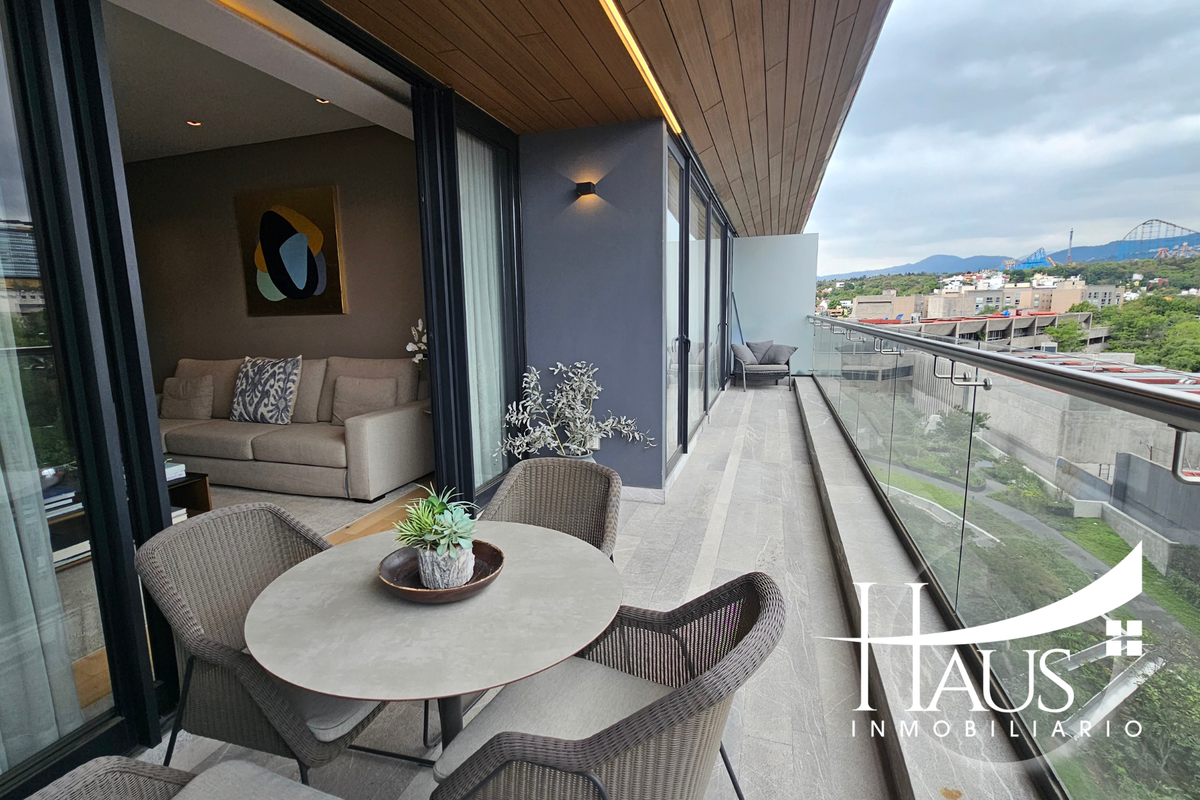 Al llegar al departamento cruzas un recibidor que da paso a un espacio social abierto: sala, comedor y cocina con barra que se integran para que la convivencia fluya con total naturalidad. Desde ahí accedes a la terraza, ideal para recibir visitas o simplemente relajarte con vistas hacia los jardines del desarrollo.