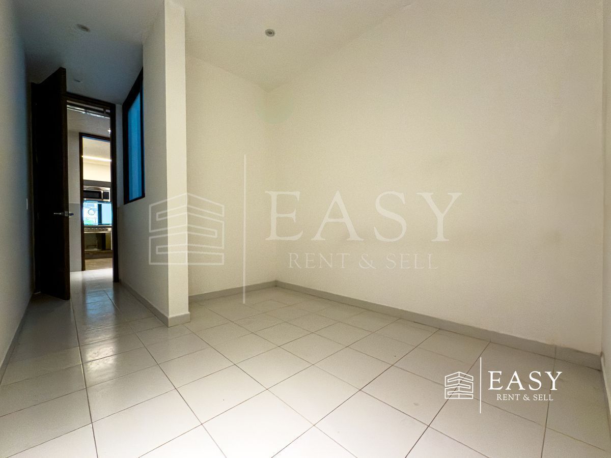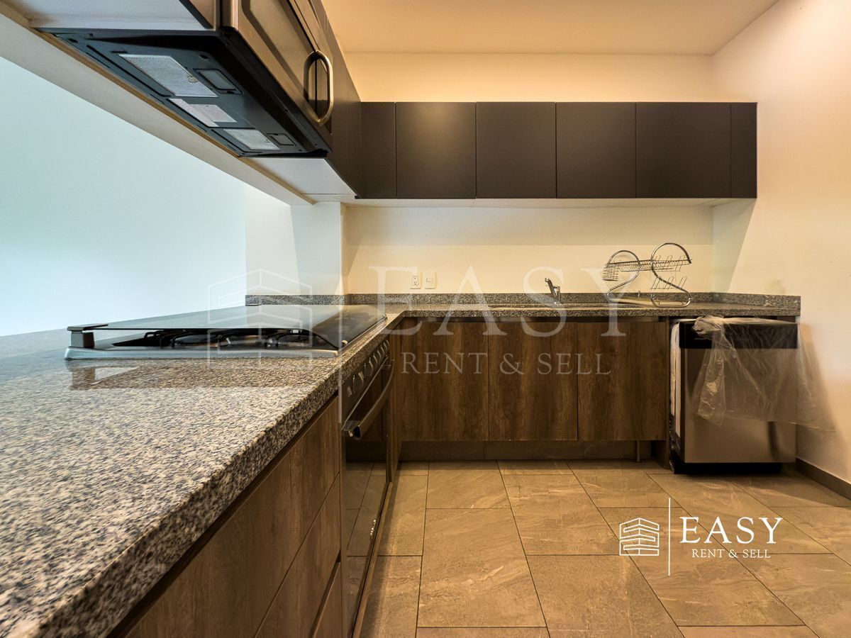 Cuenta con una amplia sala-comedor con salida a un balcón, cocina moderna equipada y un práctico baño de visitas. Tiene 2 recámaras con techos altos y excelentes clósets; ambas con acceso a terrazas privadas.